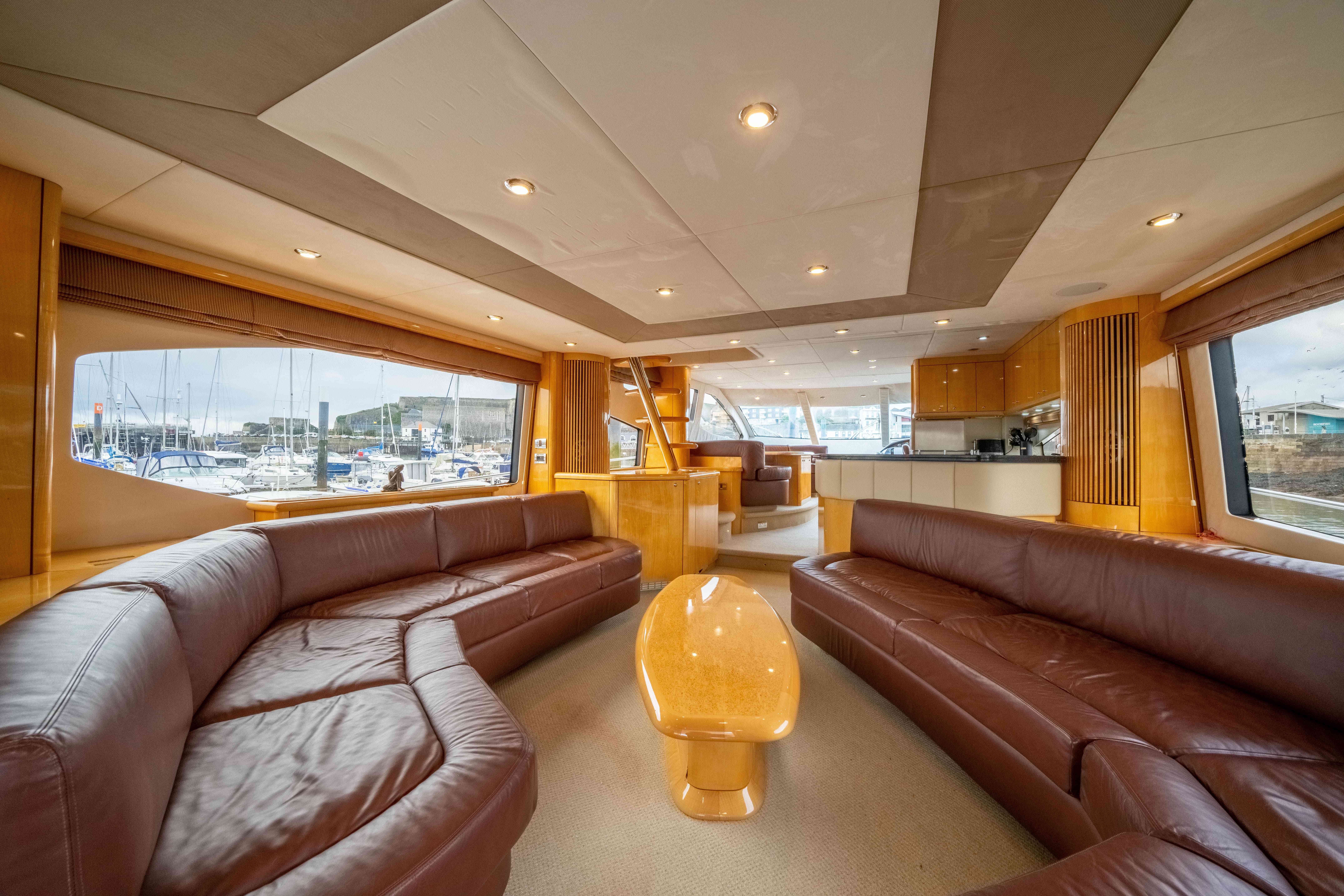 The Fairline 78 main deck layout provides a great basis for a more divided seating and dining area approach. This really gave us the opportunity to create quite a residential lounge feeling to the aft seating area.