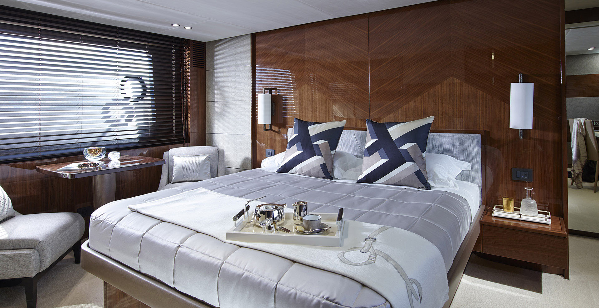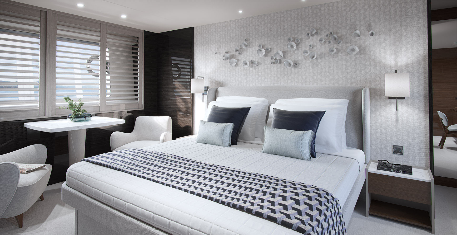 A beautiful contrast is achieved between deep gloss Macassar Ebony timber bulkheads and the fresh woven, patterned fabric to the headboard bulkhead. Elegant ceramic wall artwork with a dreamlike quality has been installed to optimise the feeling of tranquillity in this space. Underneath, the now plump headboard has been raised in height for extra comfort. The curvaceous language seen in the saloon is echoed with a hero dressing table chair by Italian designers Ceccotti, while the shapely breakfast chairs are custom-sized to suit this space perfectly. The breakfast table and bedside tables now showcase beautiful marble tops, which not only lift the space visually but also provide a practical solution. The elegant saddle-stitched leather that wraps the base of the breakfast table is beautifully echoed as a wrap around the side tables.
