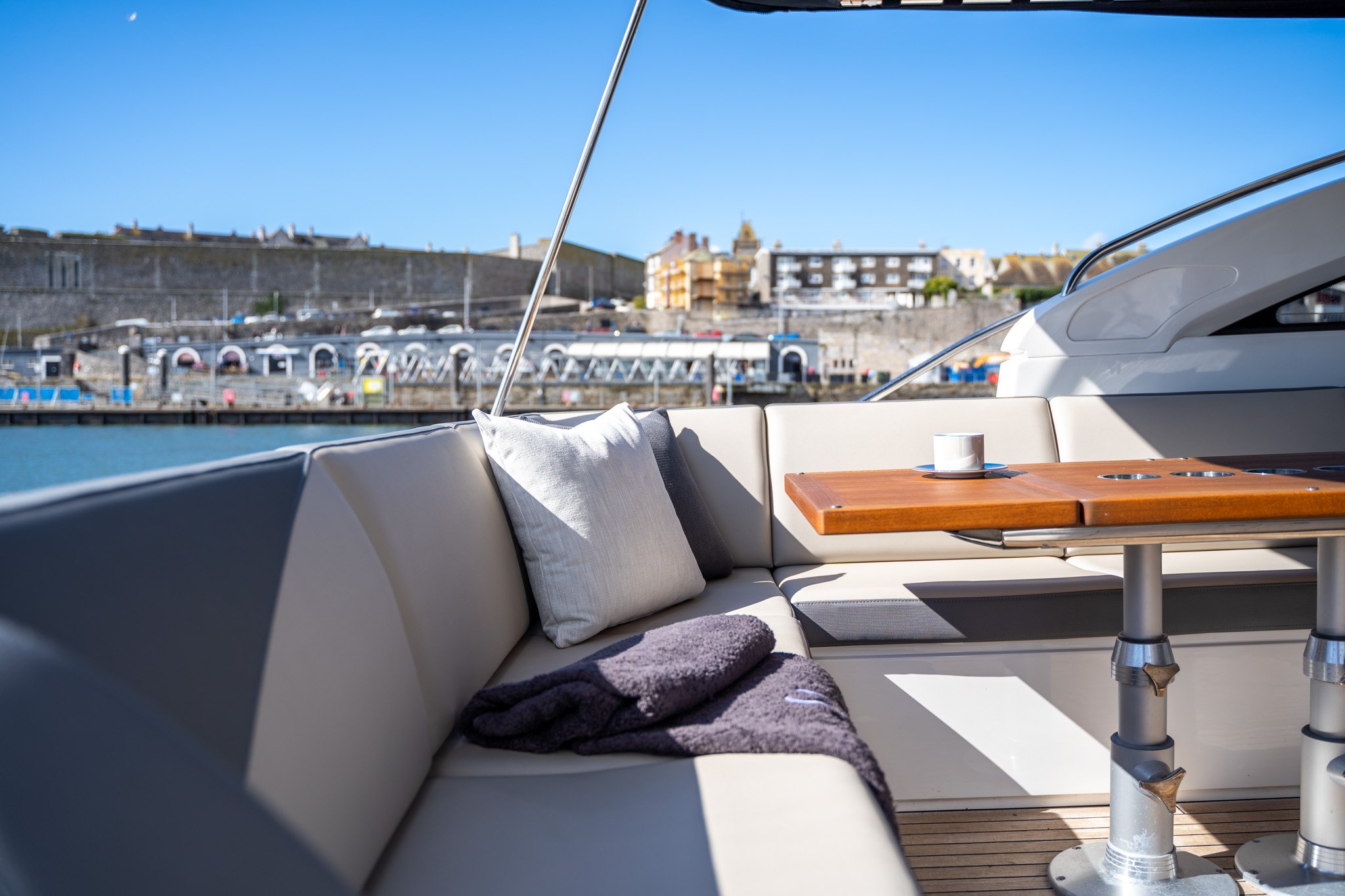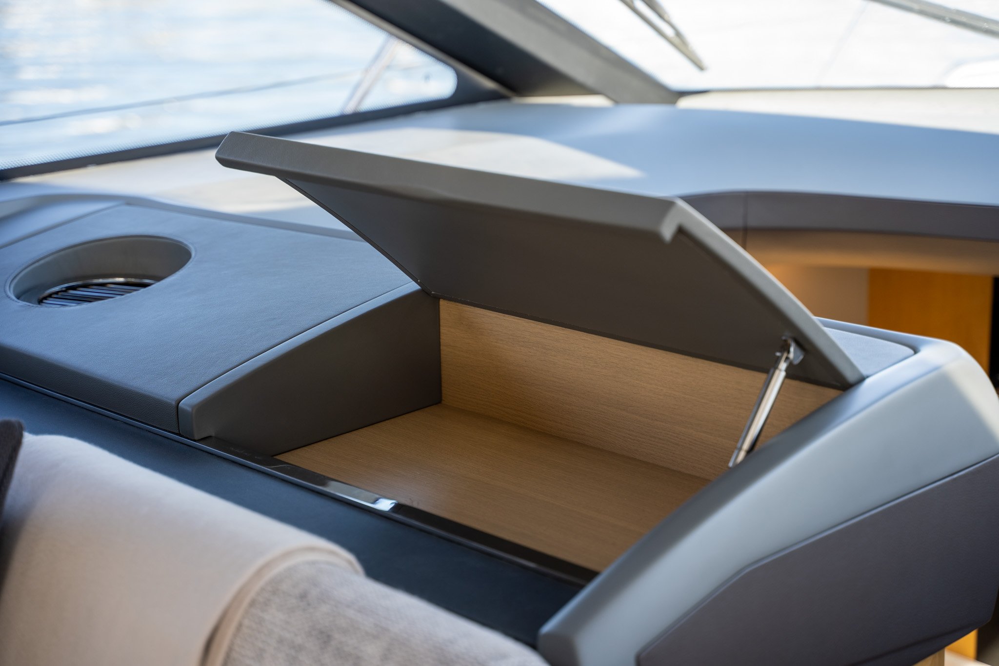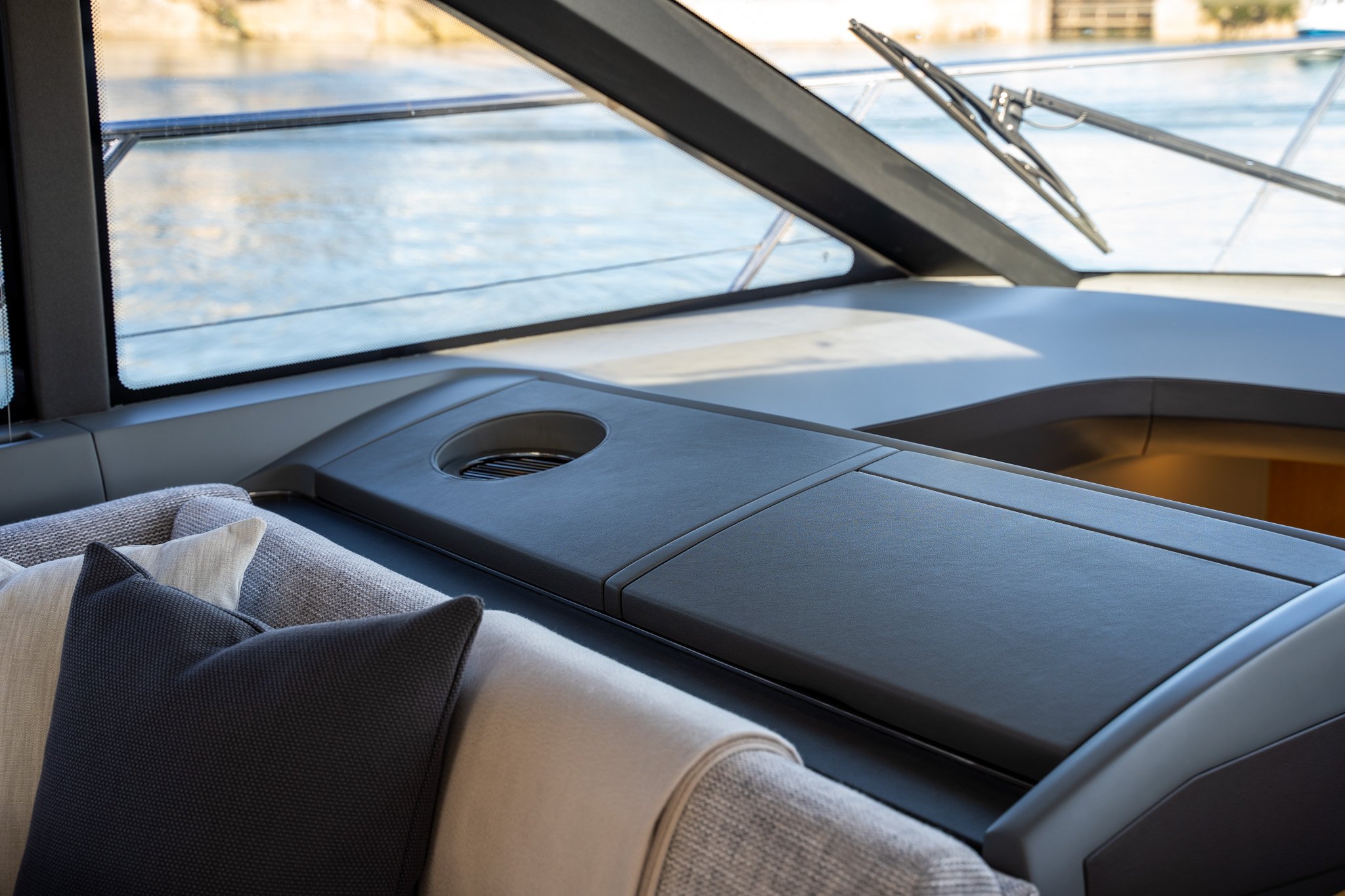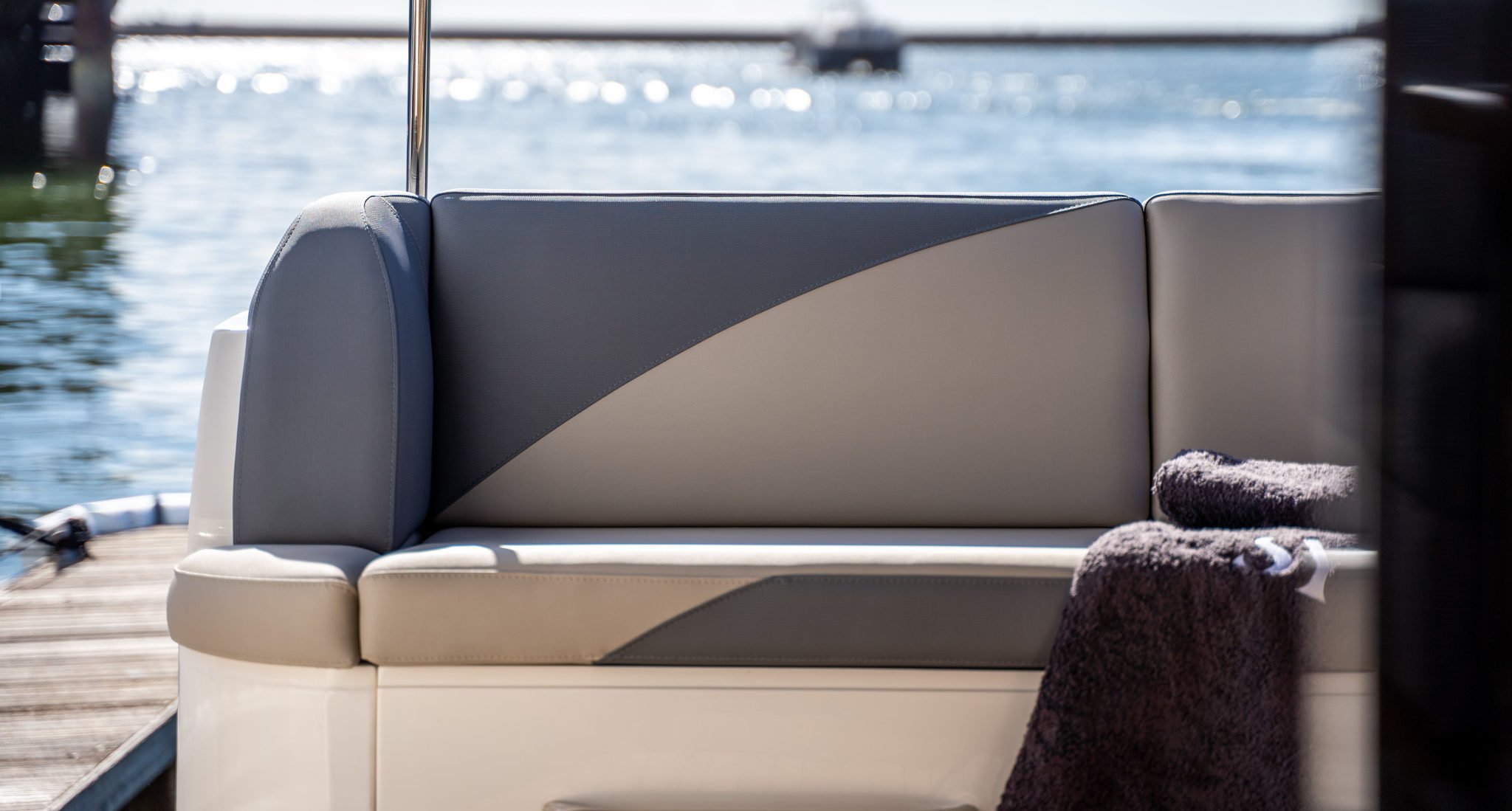 The foredeck sunpads follow the same design language as the cockpit upholstery, but extra interest and texture has been added to the design with the use of fluted stitching in the contrast panels.