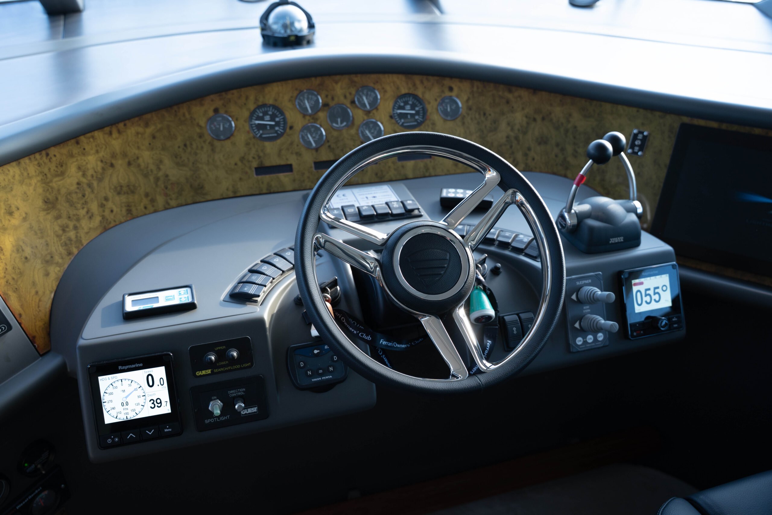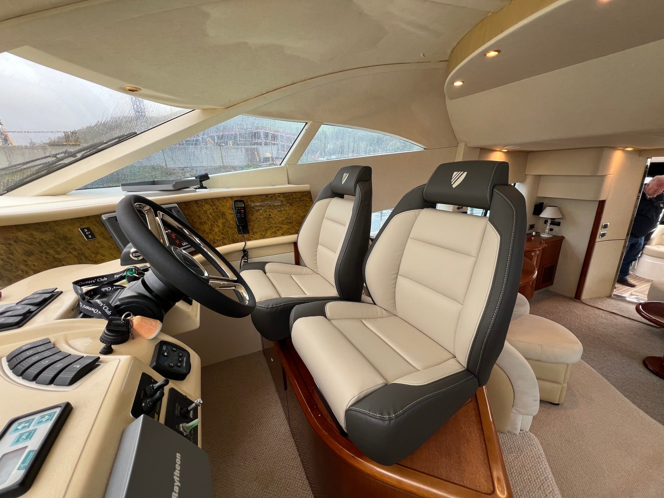 The helm has been totally transformed by painting the console, upgrading the navigation and redesigning the helmseats. Redoing the entire headlining throughout the boat and the window mullions totally transforms the area.