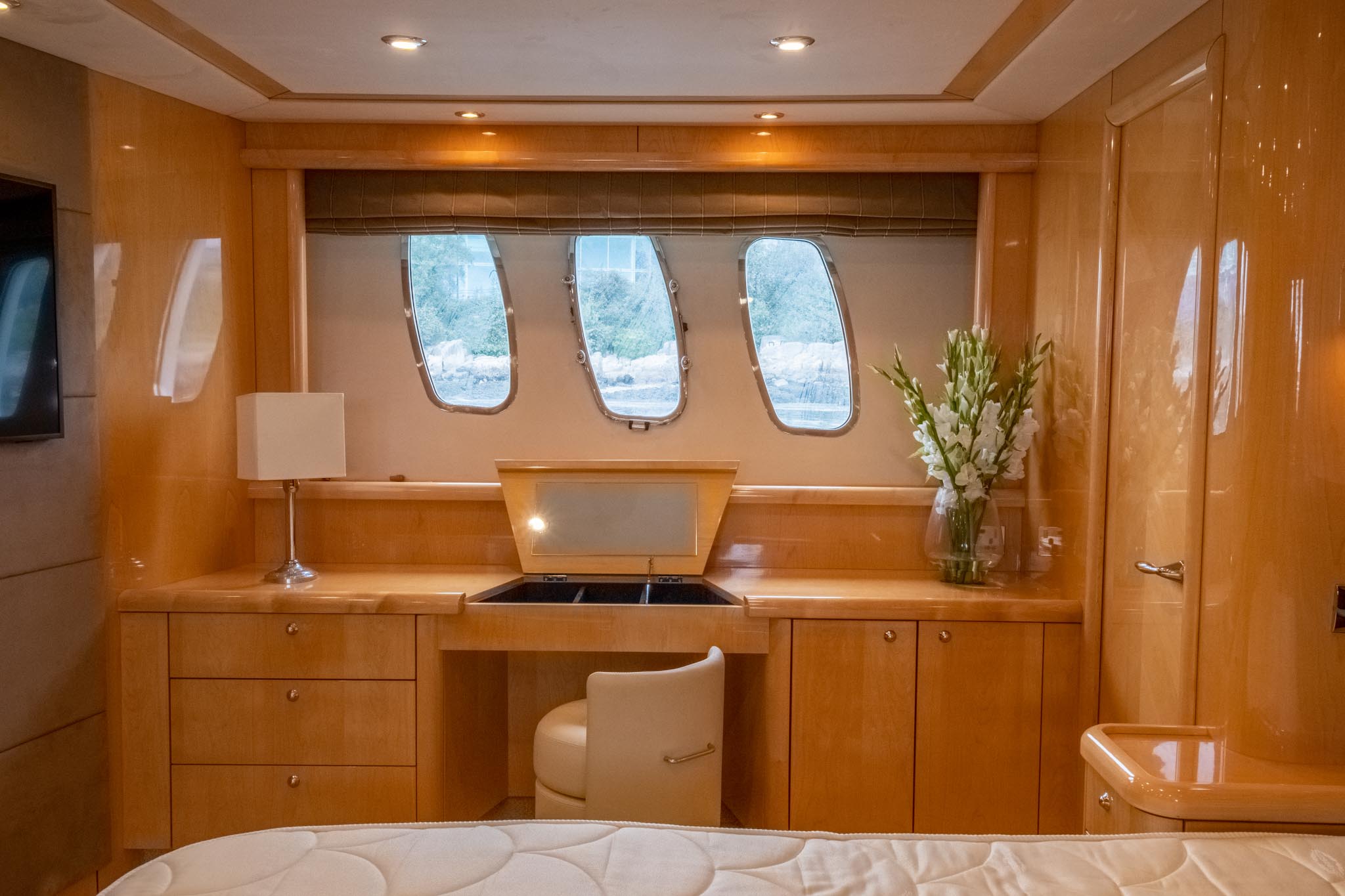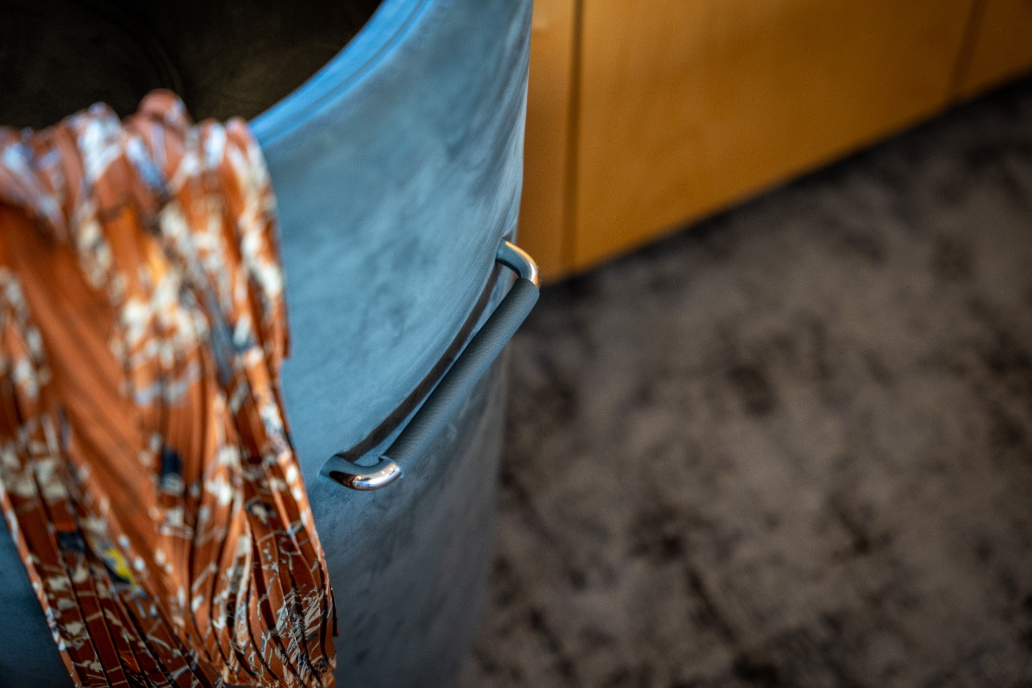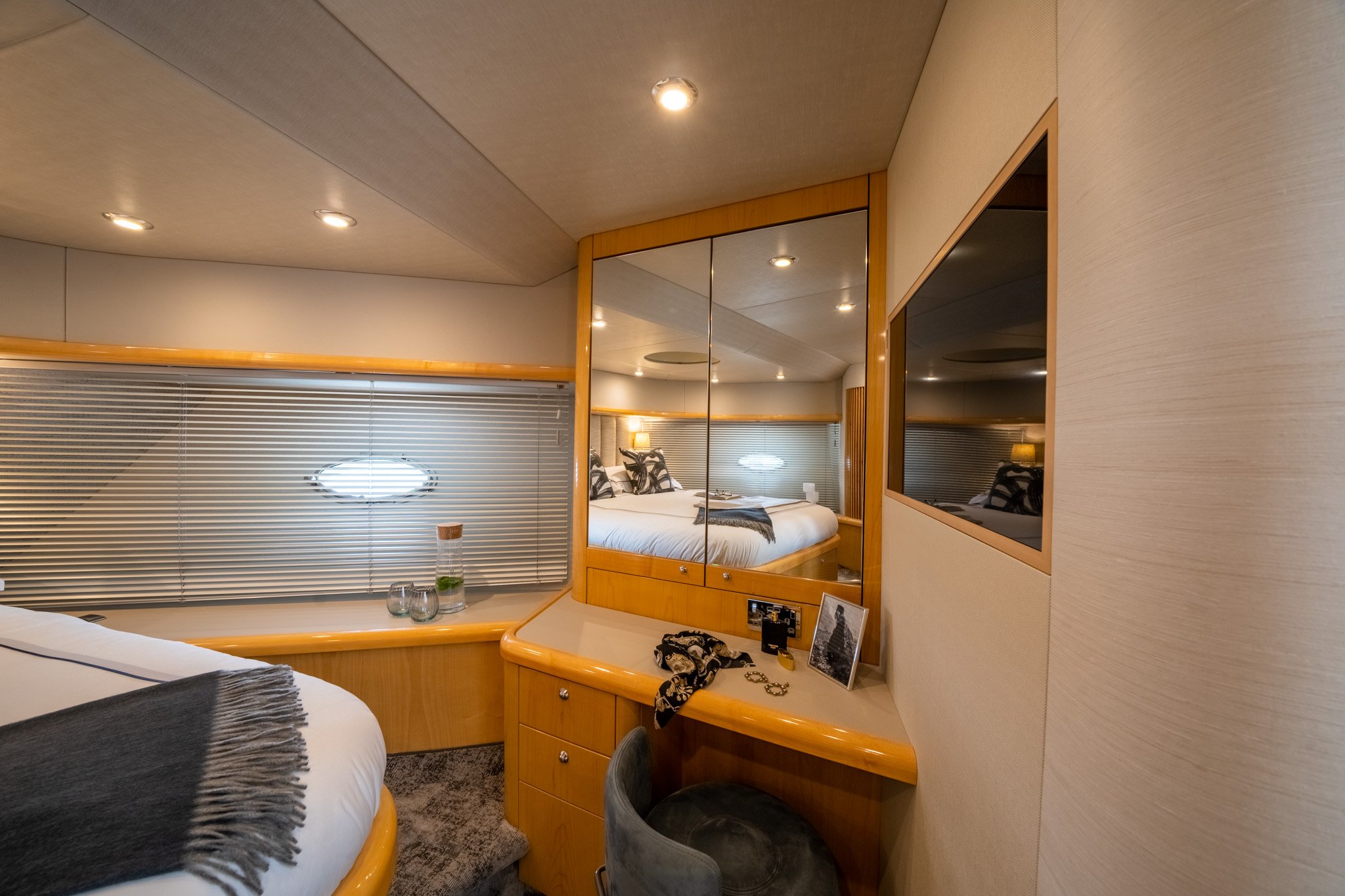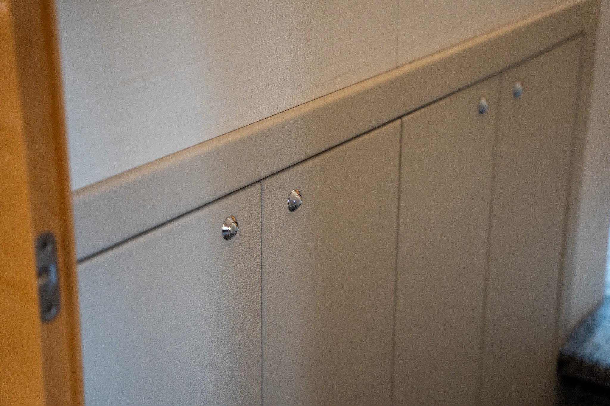 We have covered the vanity unit original Sunseeker stools in the Master and the Forward Cabin – with the suede that is seen elsewhere on board, with beautiful stitch detailing and a leather wrapped handle.
