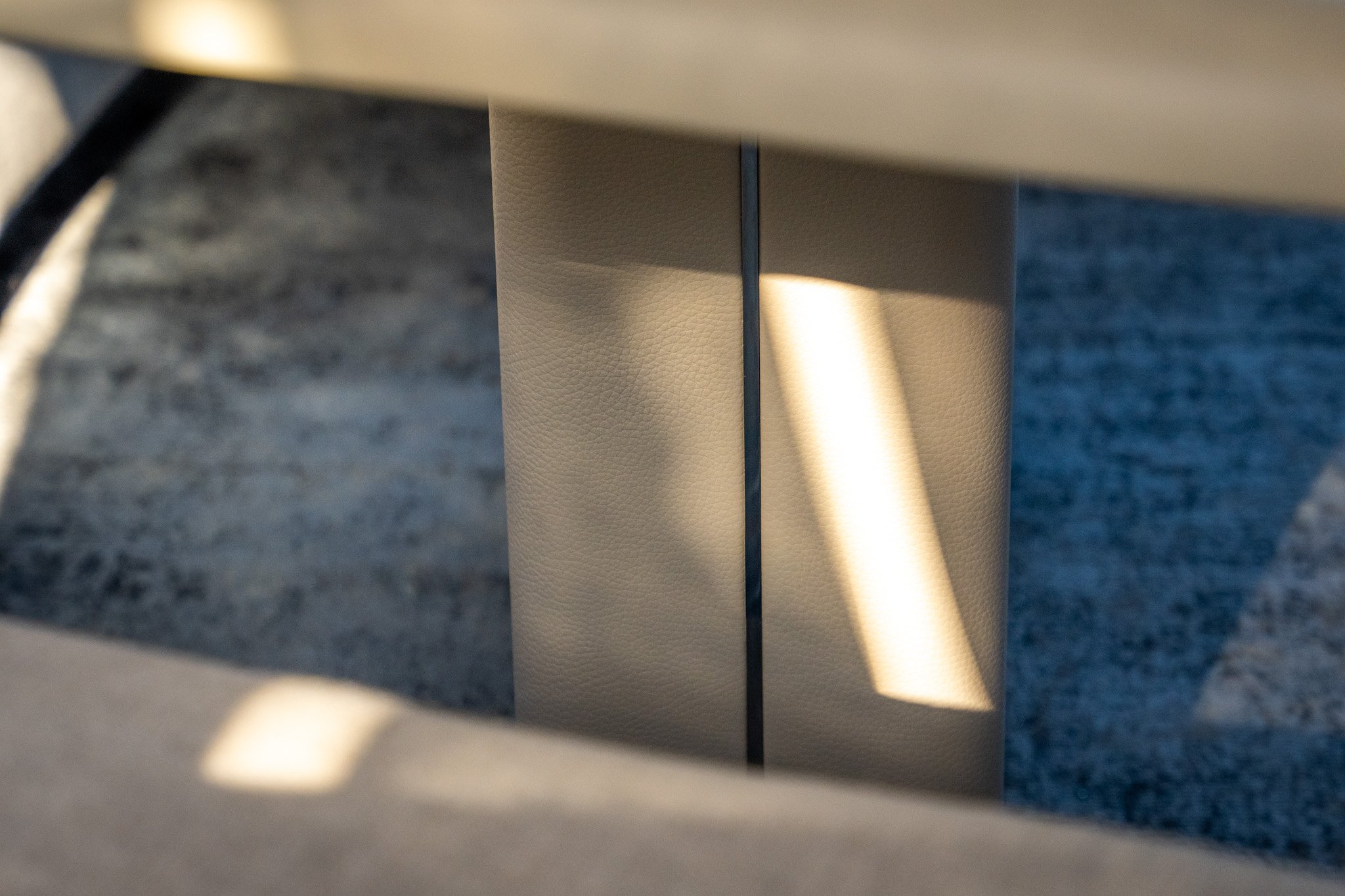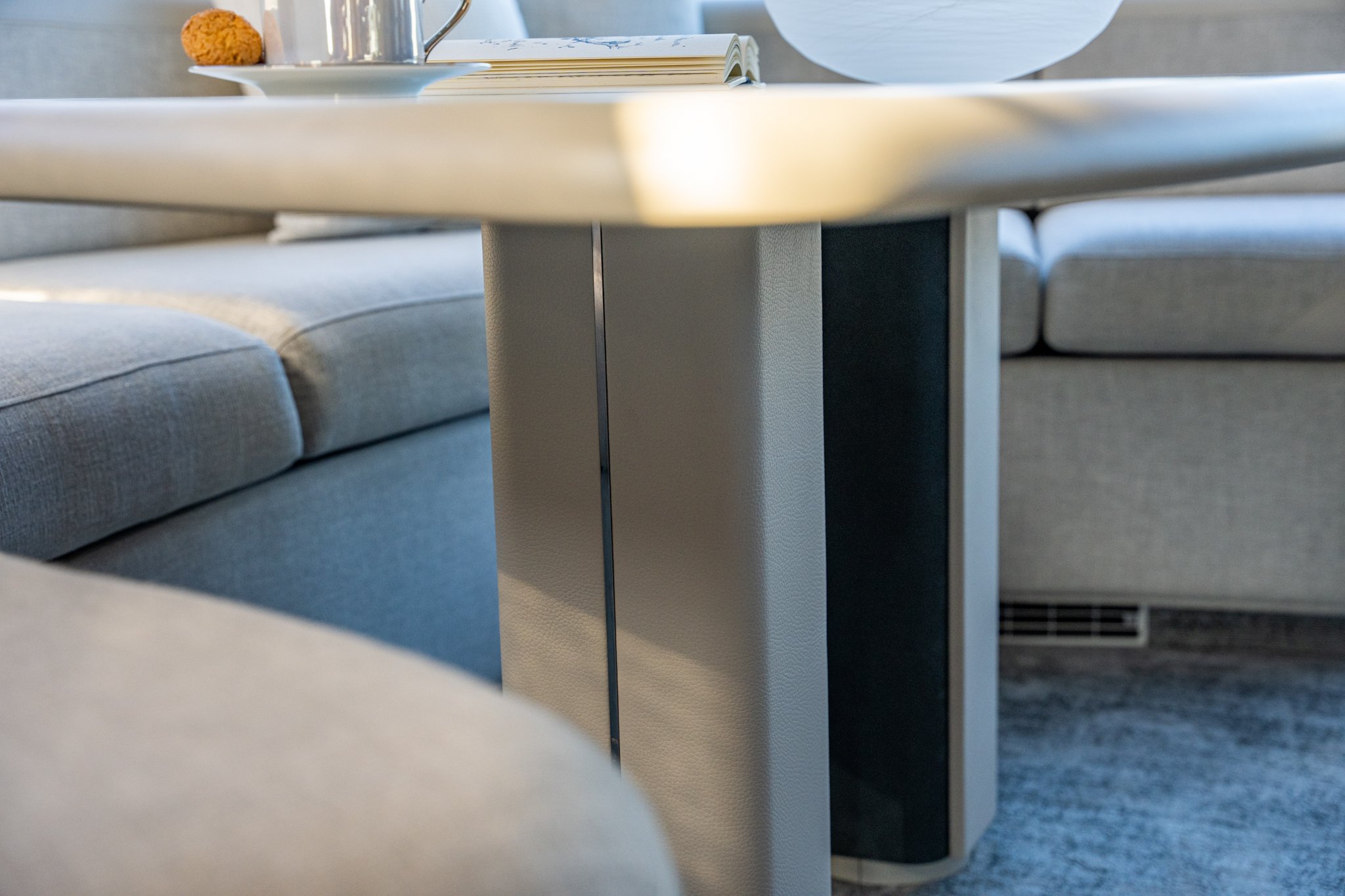 A new contemporary table top takes pride of place in the Dinette, with a solid surface insert for practicality – surrounded by a beautifully painted edge colour matched to the leather, creating a flow with the rest of the scheme.