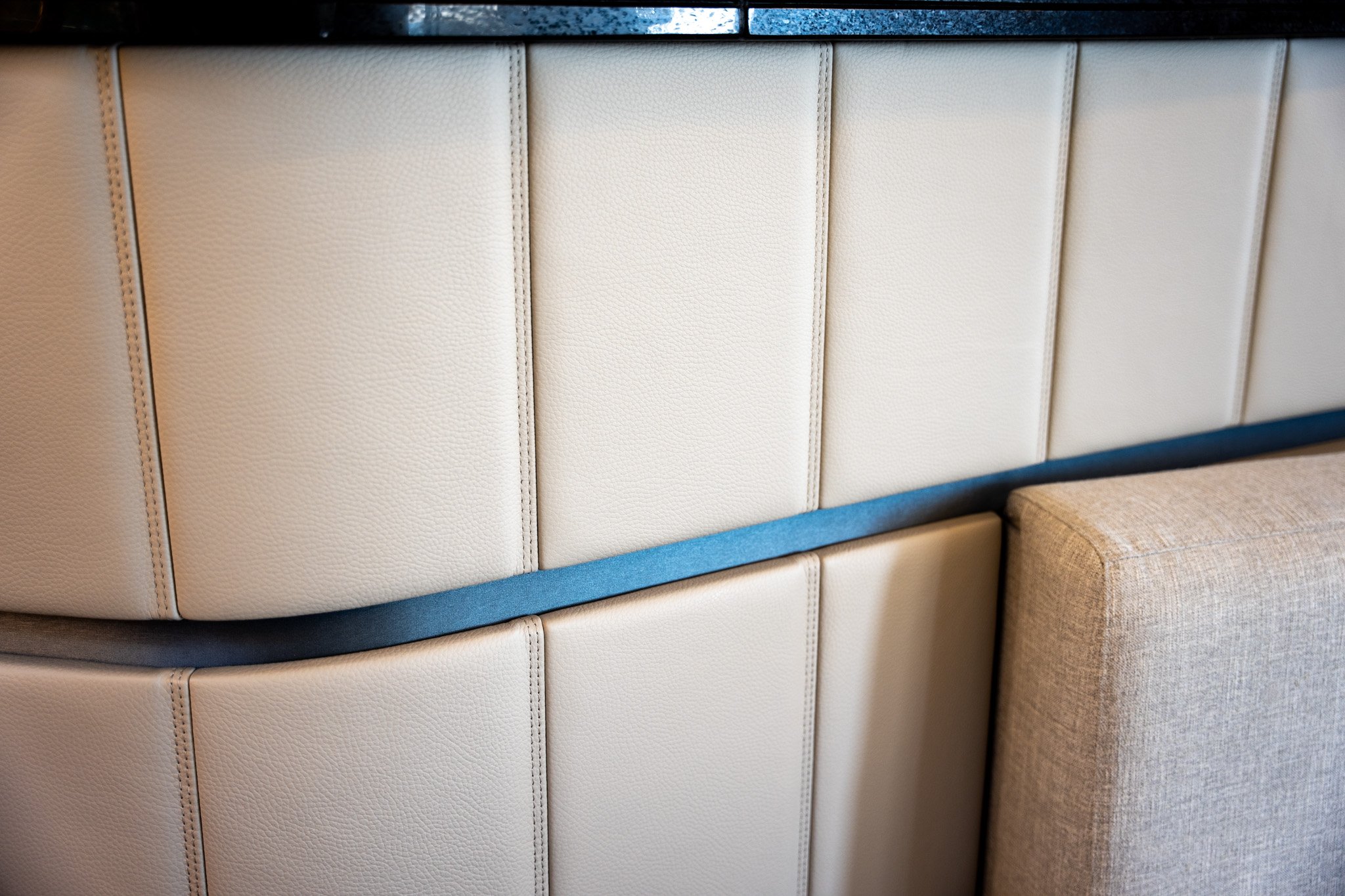 The Galley front before was lackluster in its design with leather pads to the upper section of the unit – now it has become a significant feature of the Saloon refit. We have wrapped the entire front in beautiful stitch detailed leather and added a feature teal strip through the centre for that added visual effect.