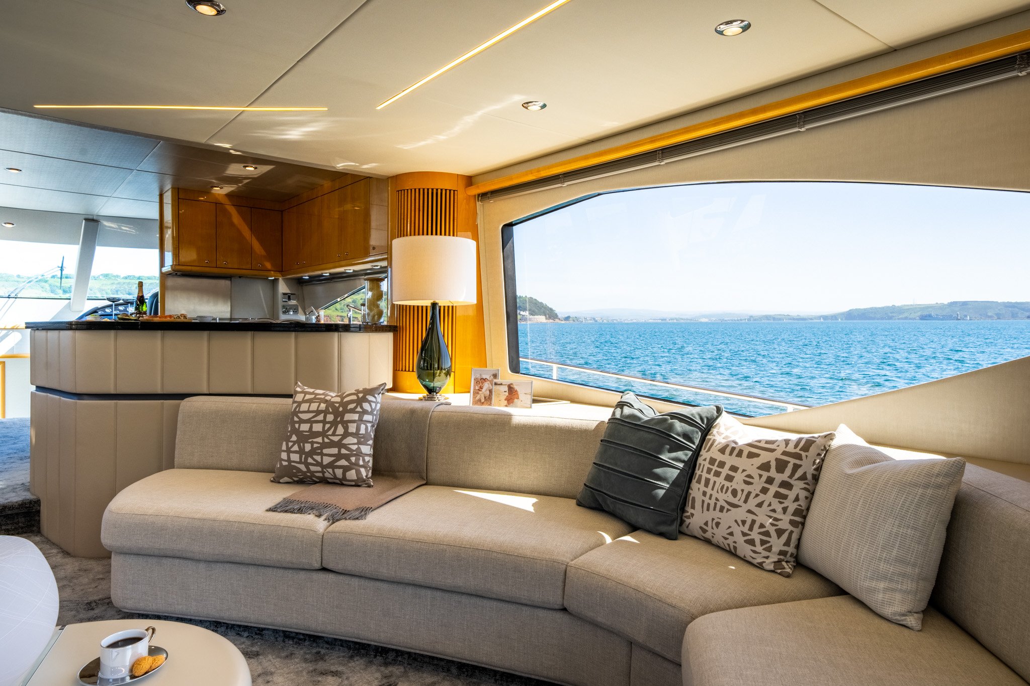 The two aft Saloon sofas, along with the Dinette sofa have all considerably reduced in size, yet increased in comfort – opening up the space and the floor area.