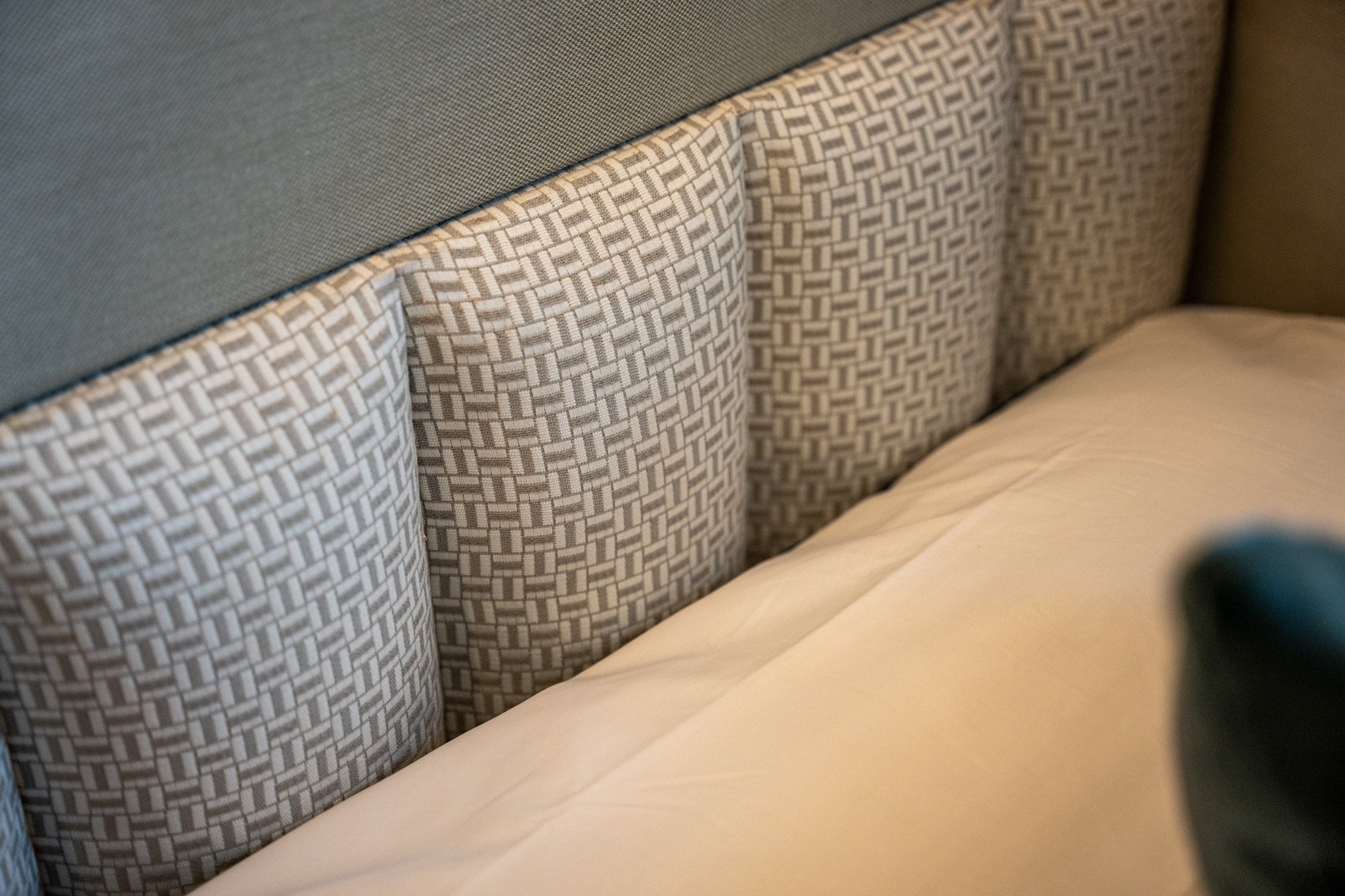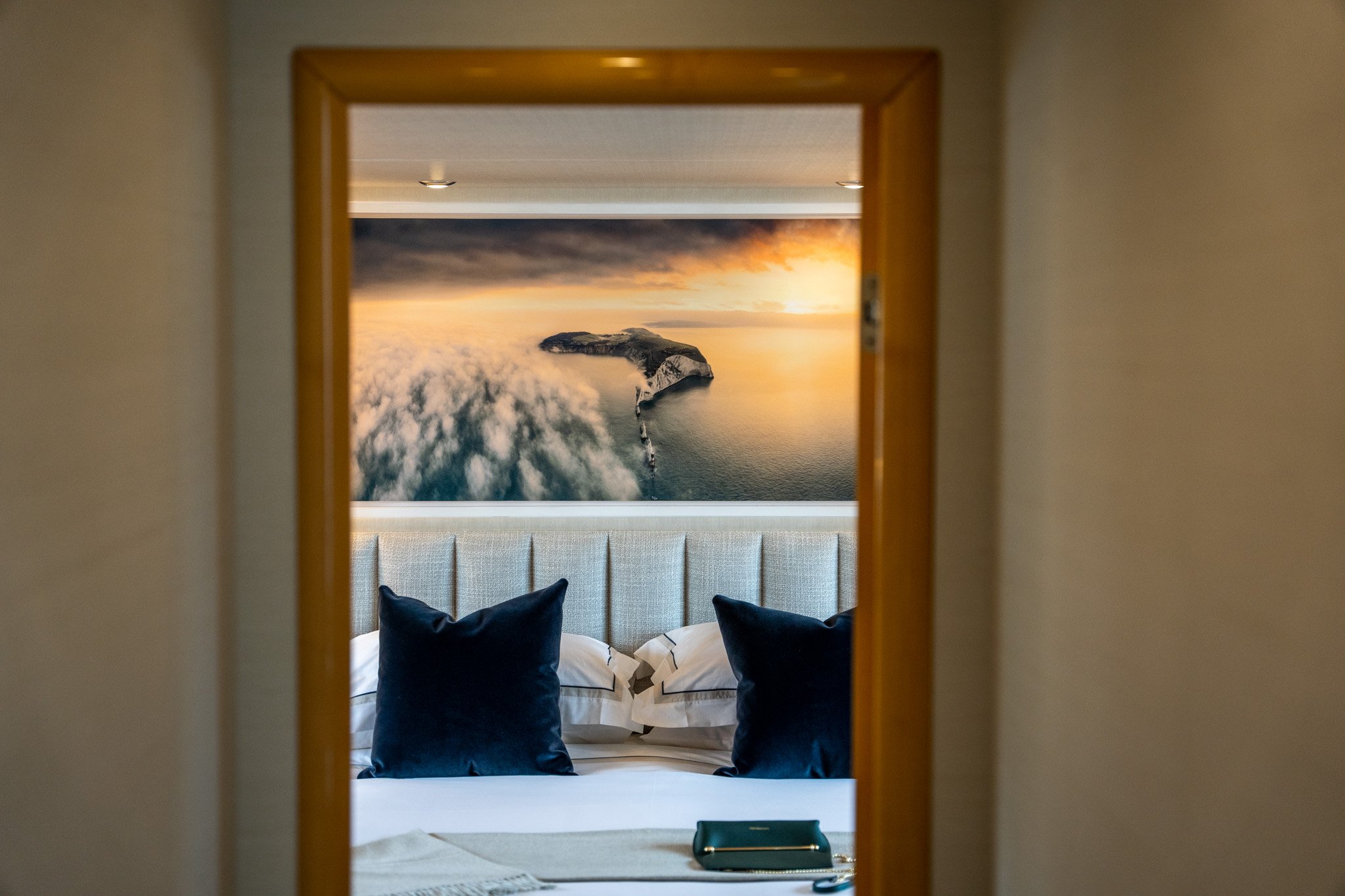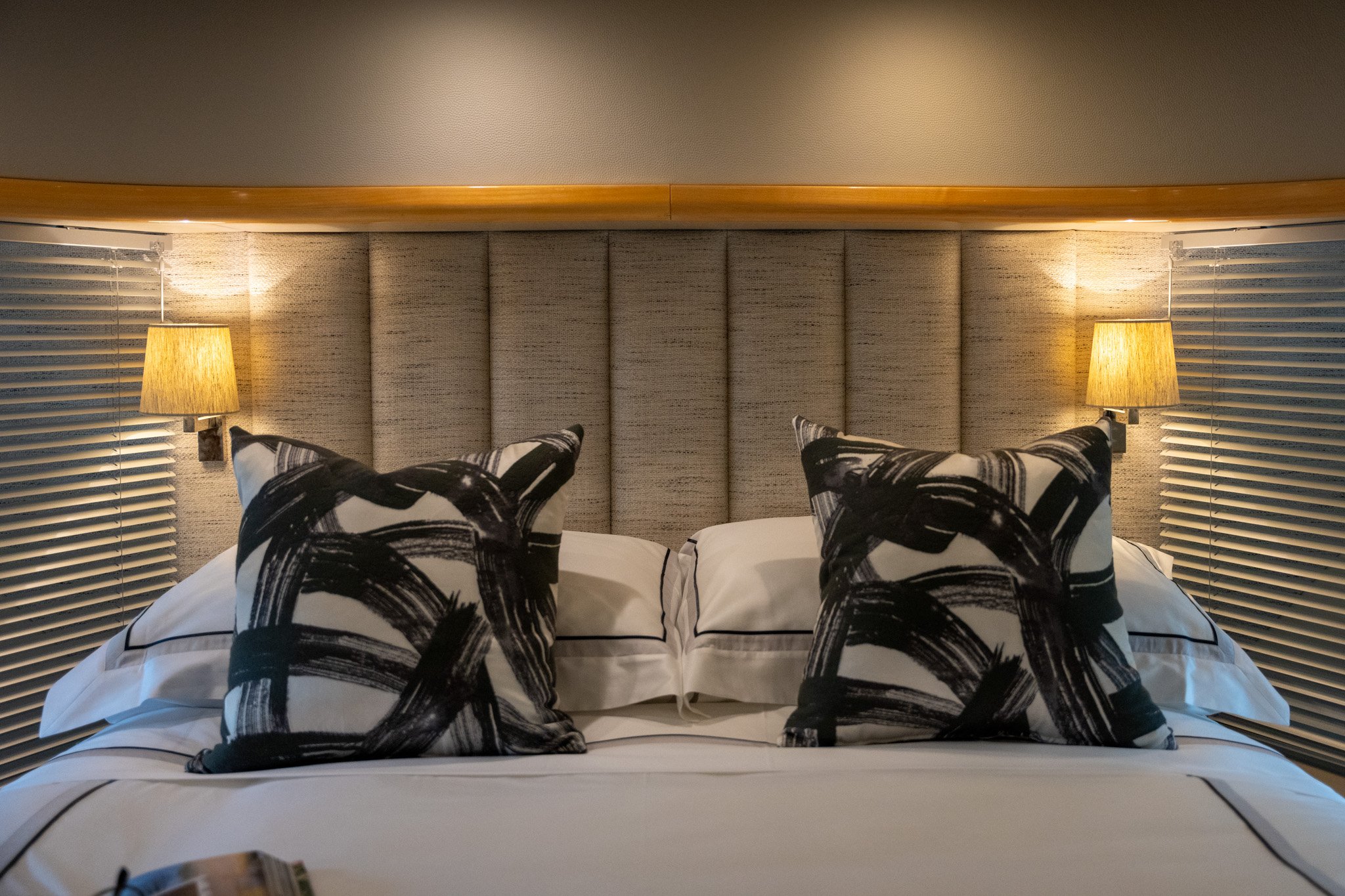 The fabrics for each Cabin headboard are environmentally conscious, sustainable materials made from waste plastic bottles. Each fabric is fully recyclable, meaning they have been repurposed for future use – similarly to the yacht they now sit within – making the fabric and yacht ‘circular’ in nature.