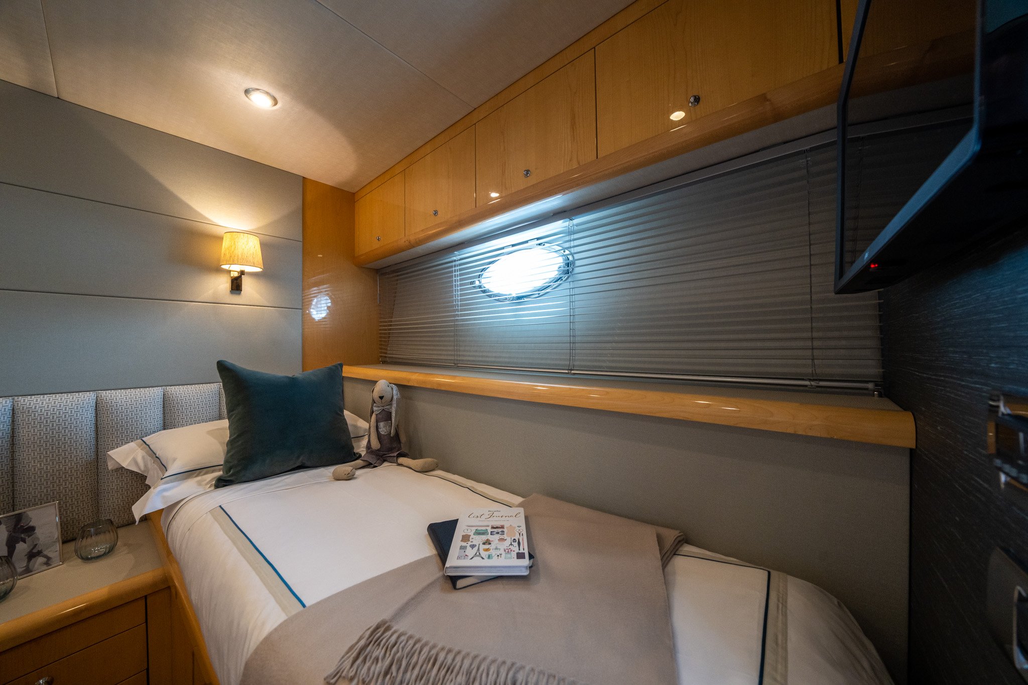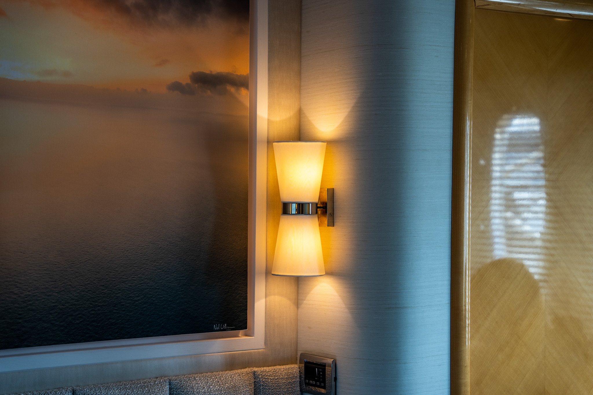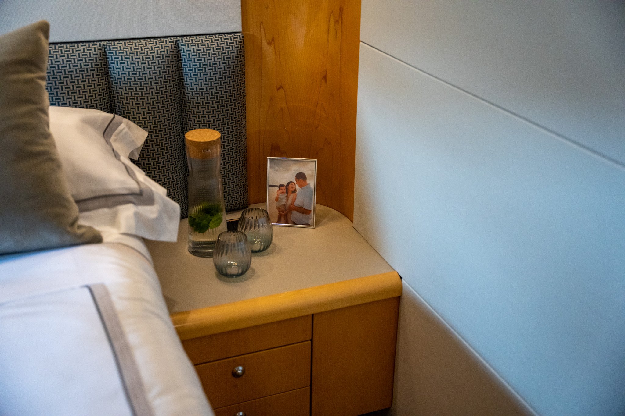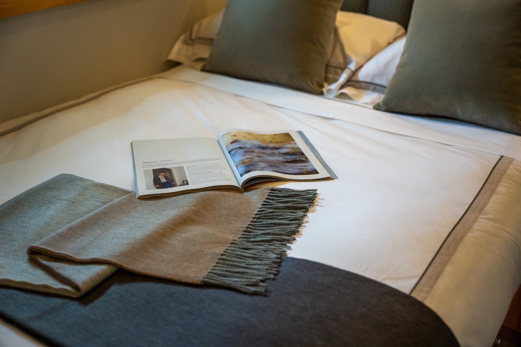 The fabrics for each Cabin headboard are environmentally conscious, sustainable materials made from waste plastic bottles. Each fabric is fully recyclable, meaning they have been repurposed for future use – similarly to the yacht they now sit within – making the fabric and yacht ‘circular’ in nature.