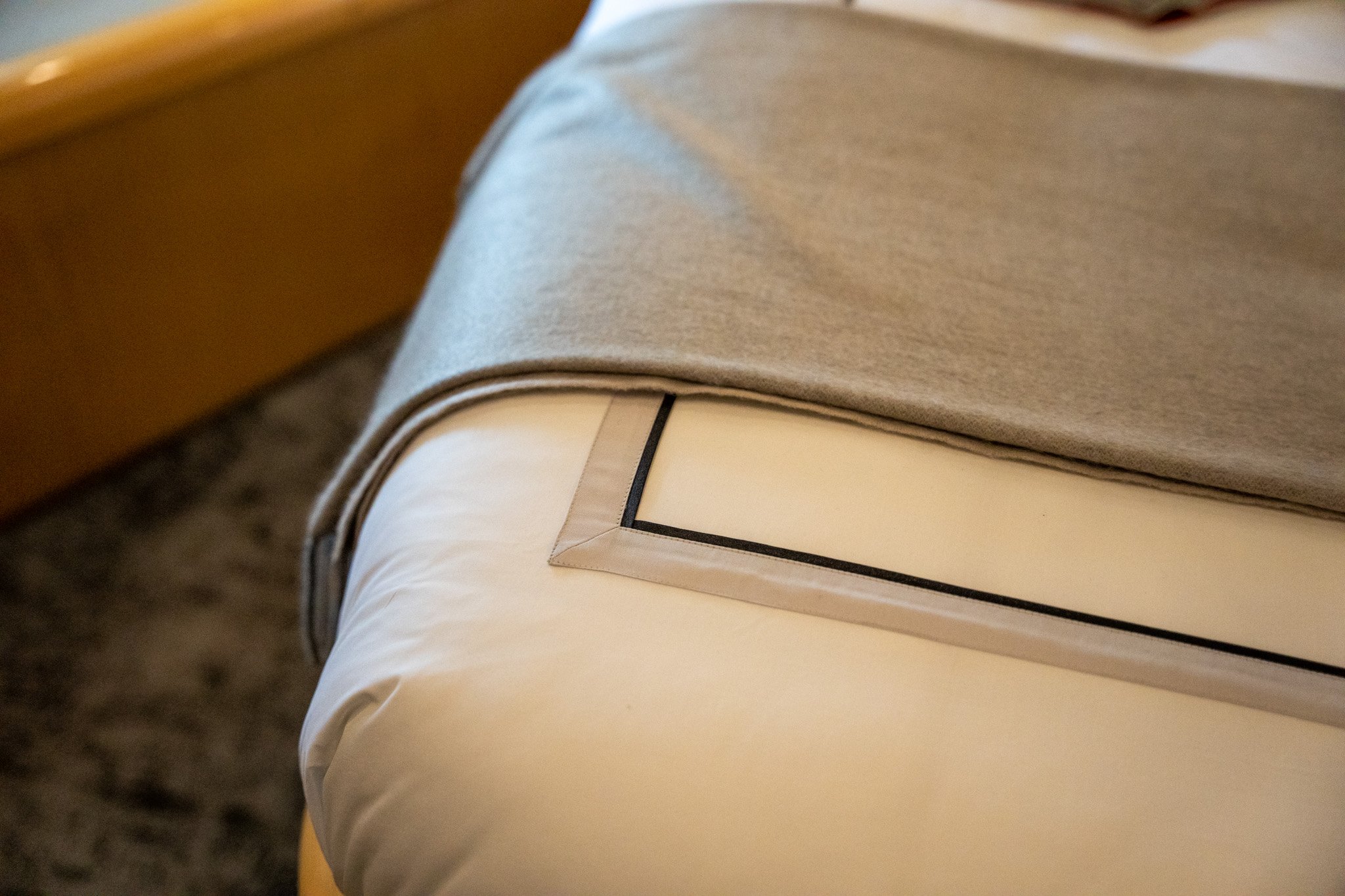 Each cabin has a set of custom luxury bedding designed specifically to match the theme associated with that cabin – shown in the colour strip detail on the duvet cover and within the scatter cushions.