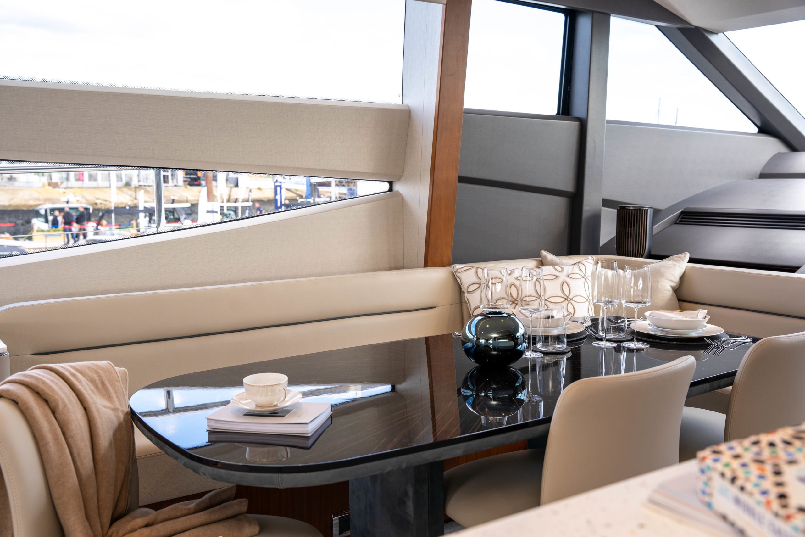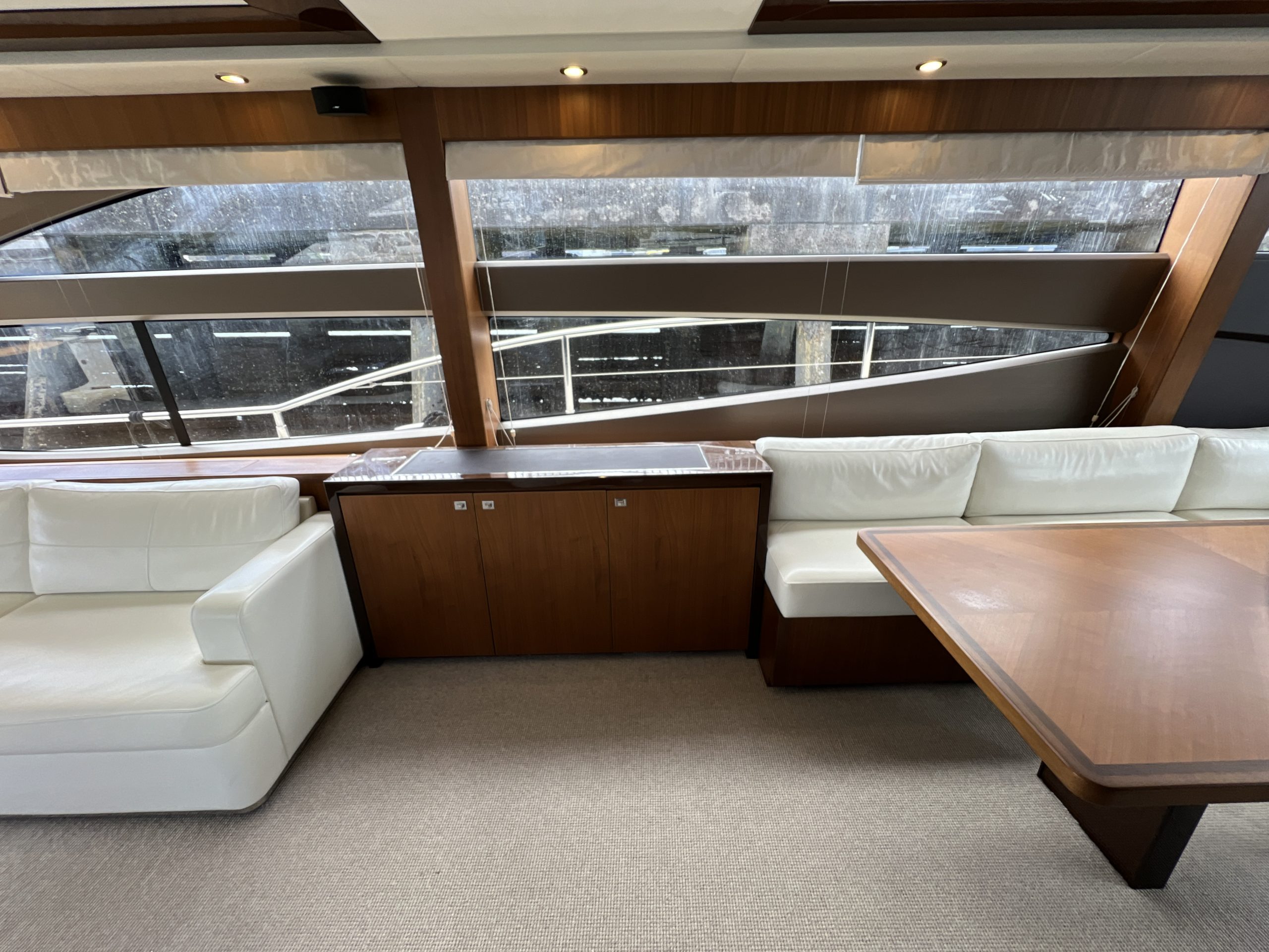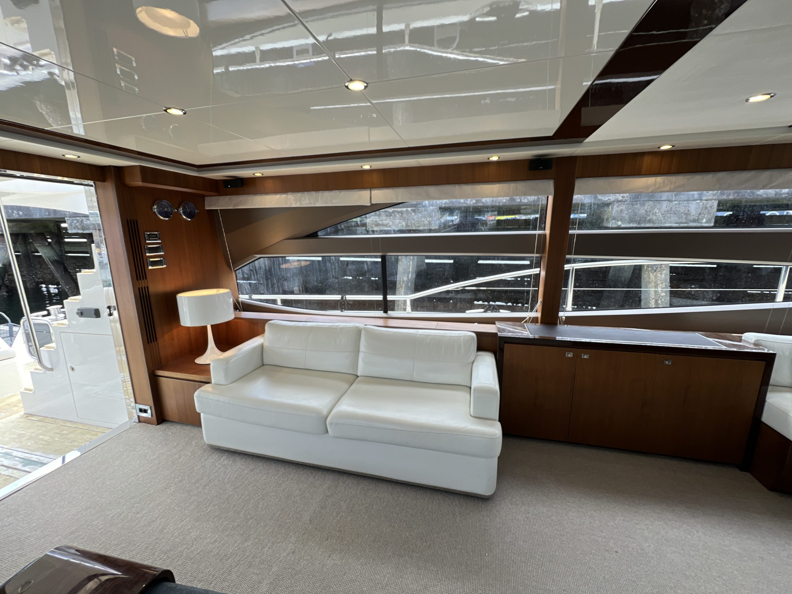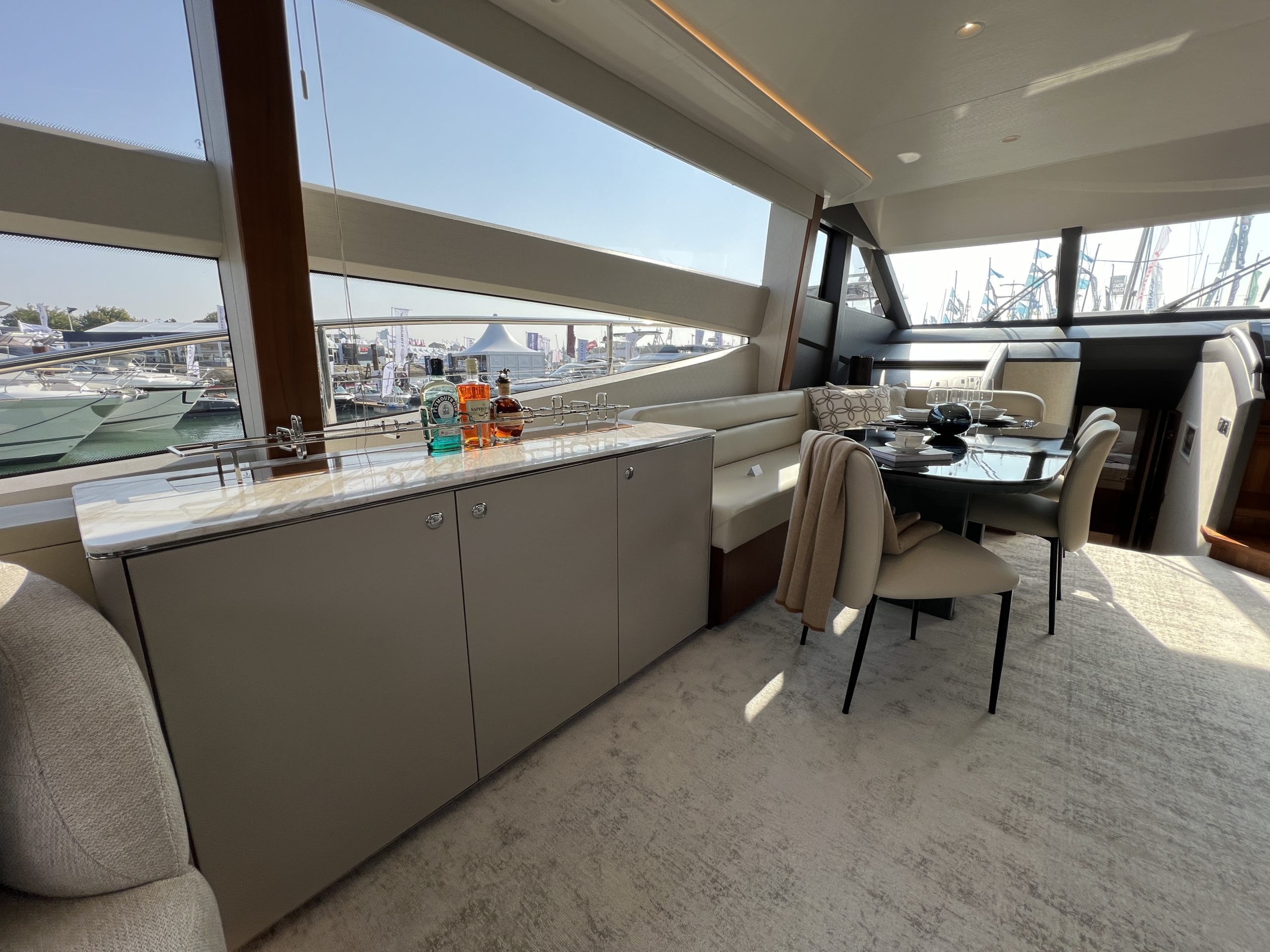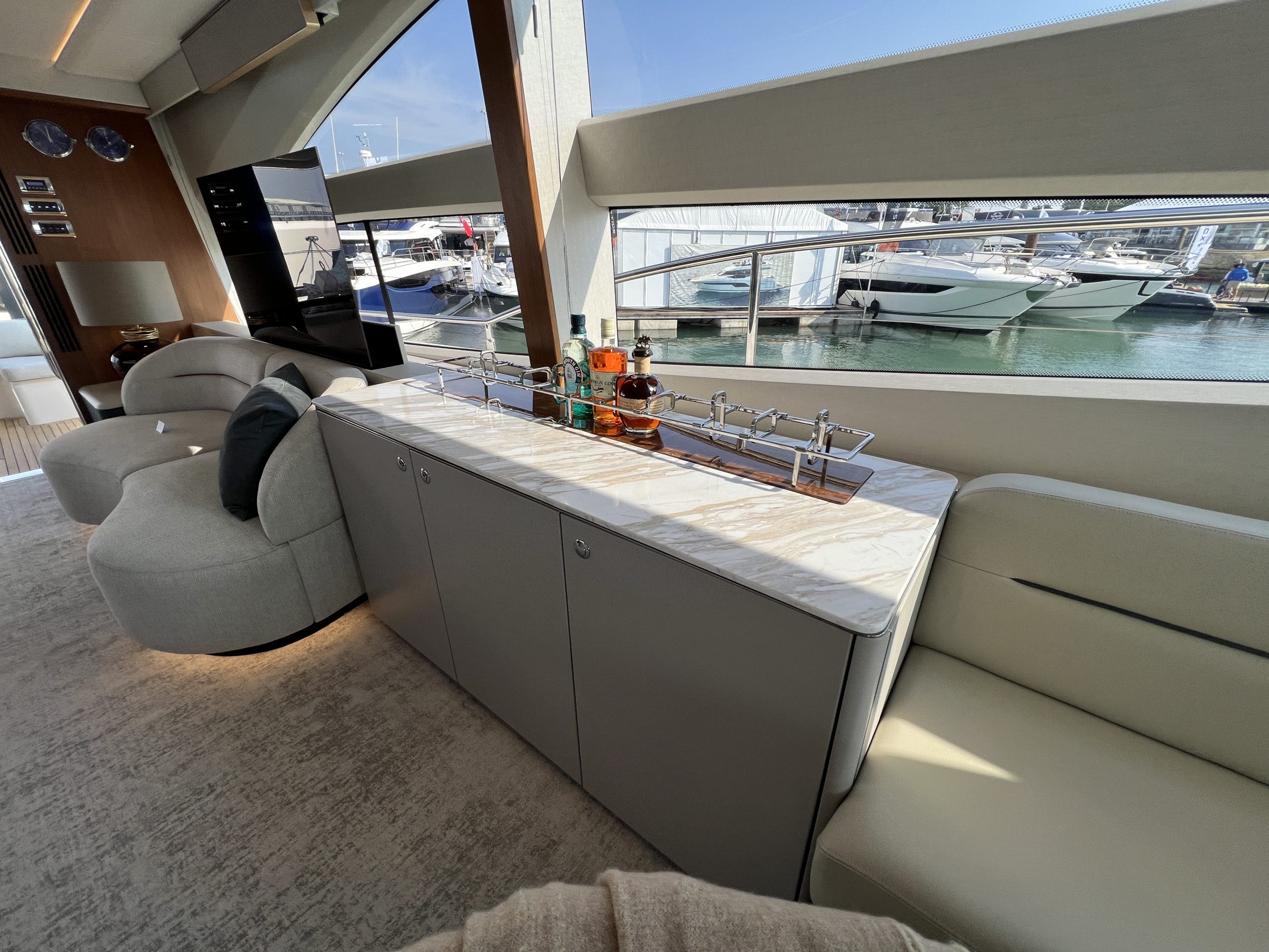 The Saloon now boasts a statement ‘rise and fall’ portside bar unit with a marble top, the bar built around specified glasses to fit inside. The portside curved sofa has been completely restyled, while the starboard sofa has been redesigned. There is a new coffee table and new curvaceous dinette sofa with a matching oval dinette table. Feature lighting, and new headlining has been added, together with sidelinings and window linings throughout the entire yacht.