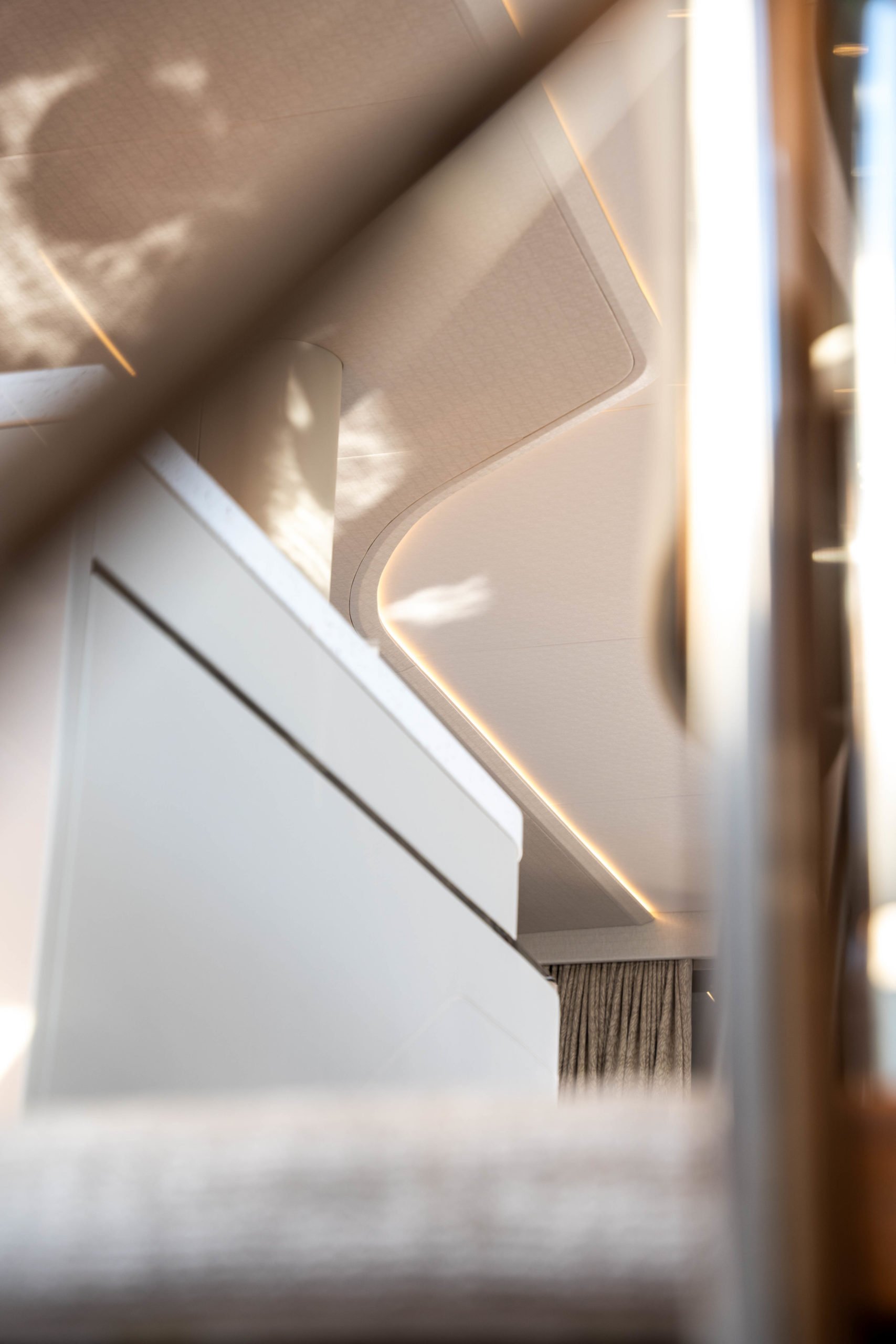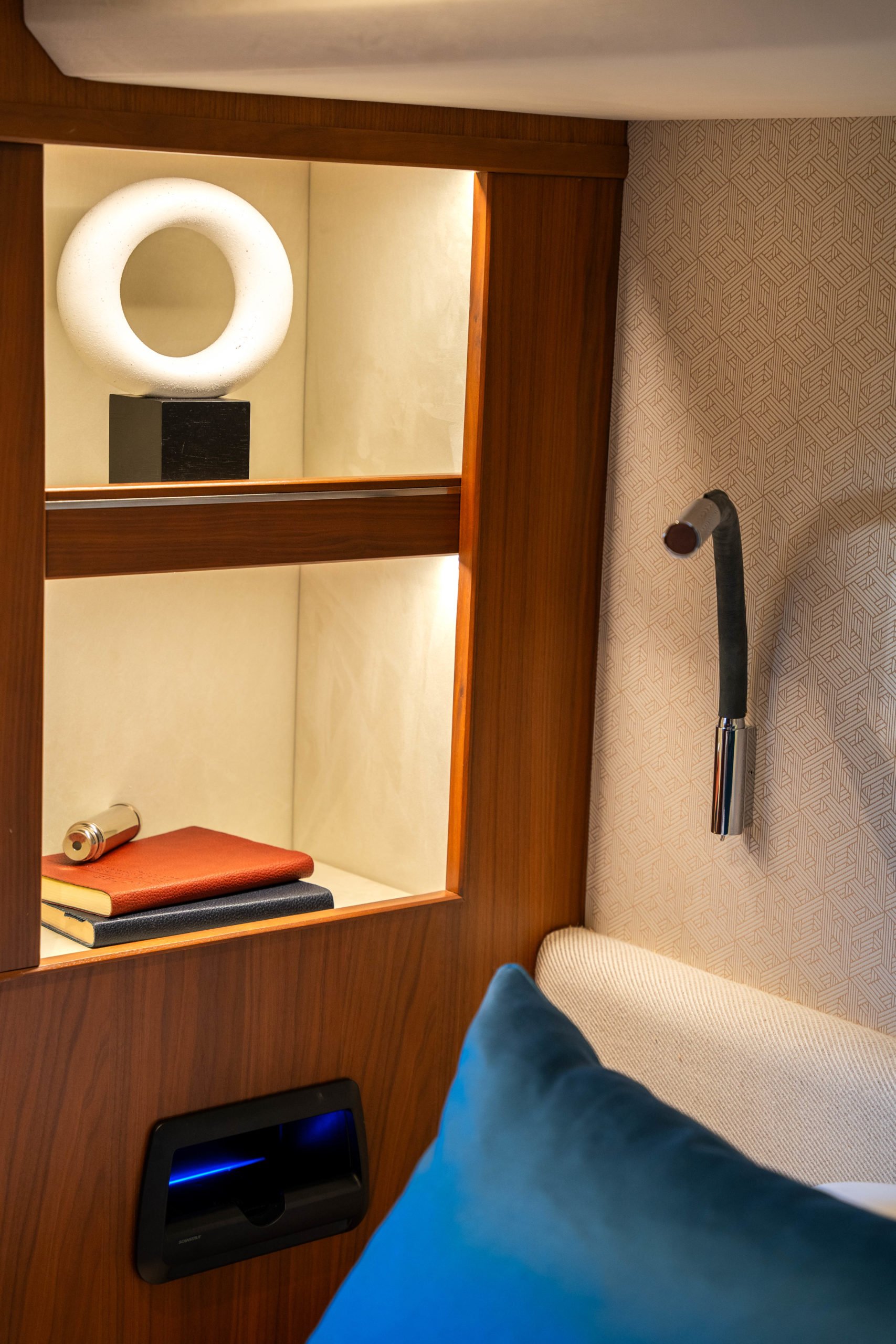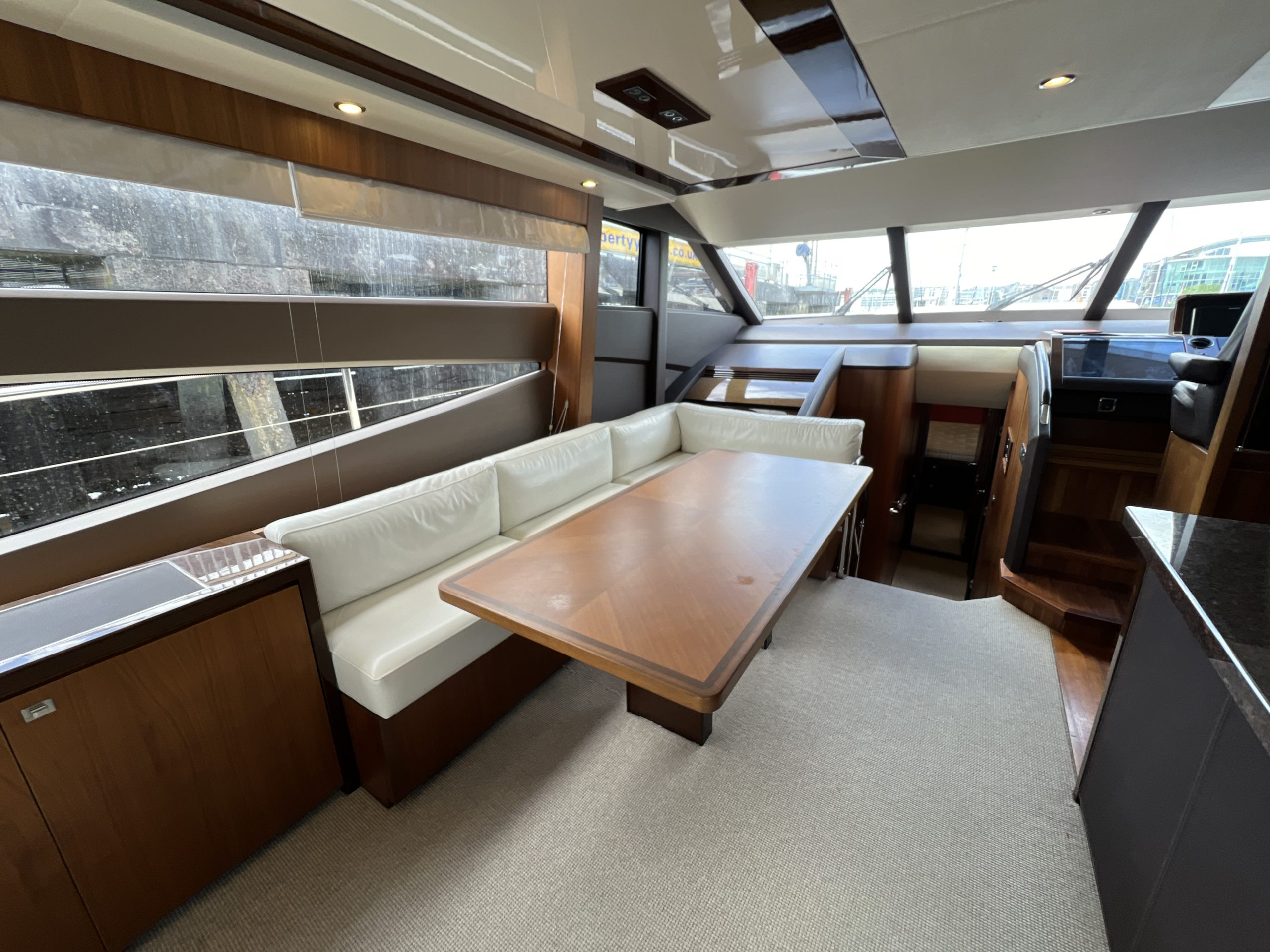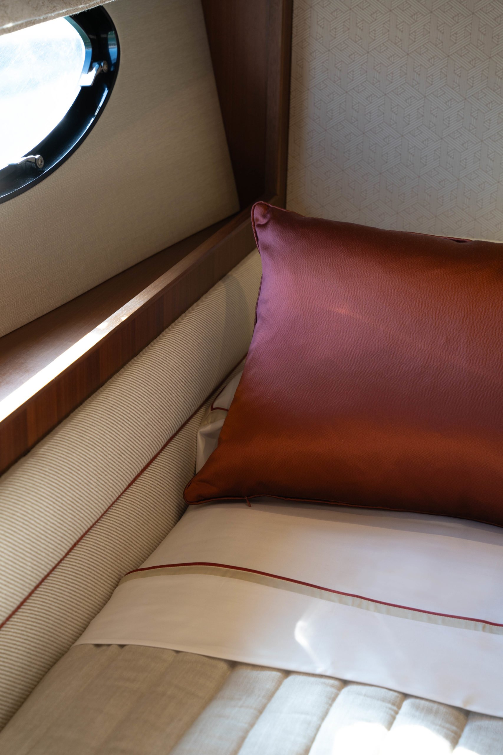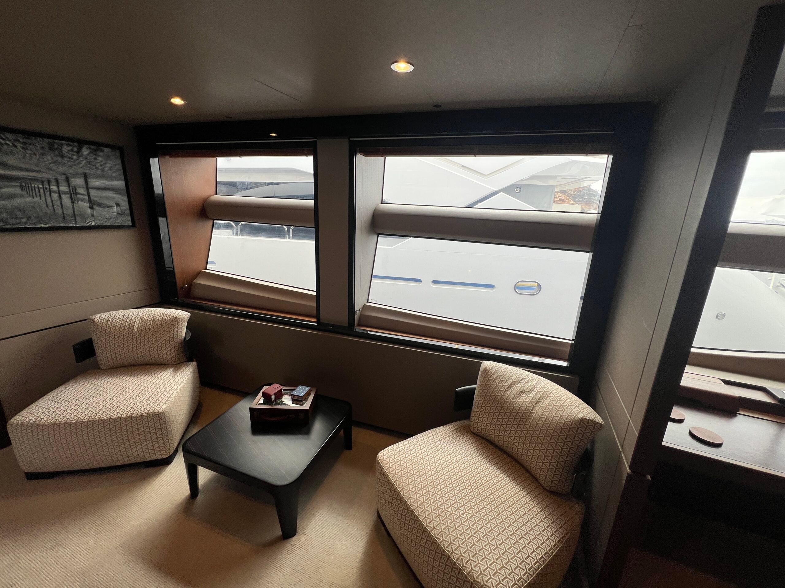 The Saloon now boasts a statement ‘rise and fall’ portside bar unit with a marble top, the bar built around specified glasses to fit inside. The portside curved sofa has been completely restyled, while the starboard sofa has been redesigned. There is a new coffee table and new curvaceous dinette sofa with a matching oval dinette table. Feature lighting, and new headlining has been added, together with sidelinings and window linings throughout the entire yacht.