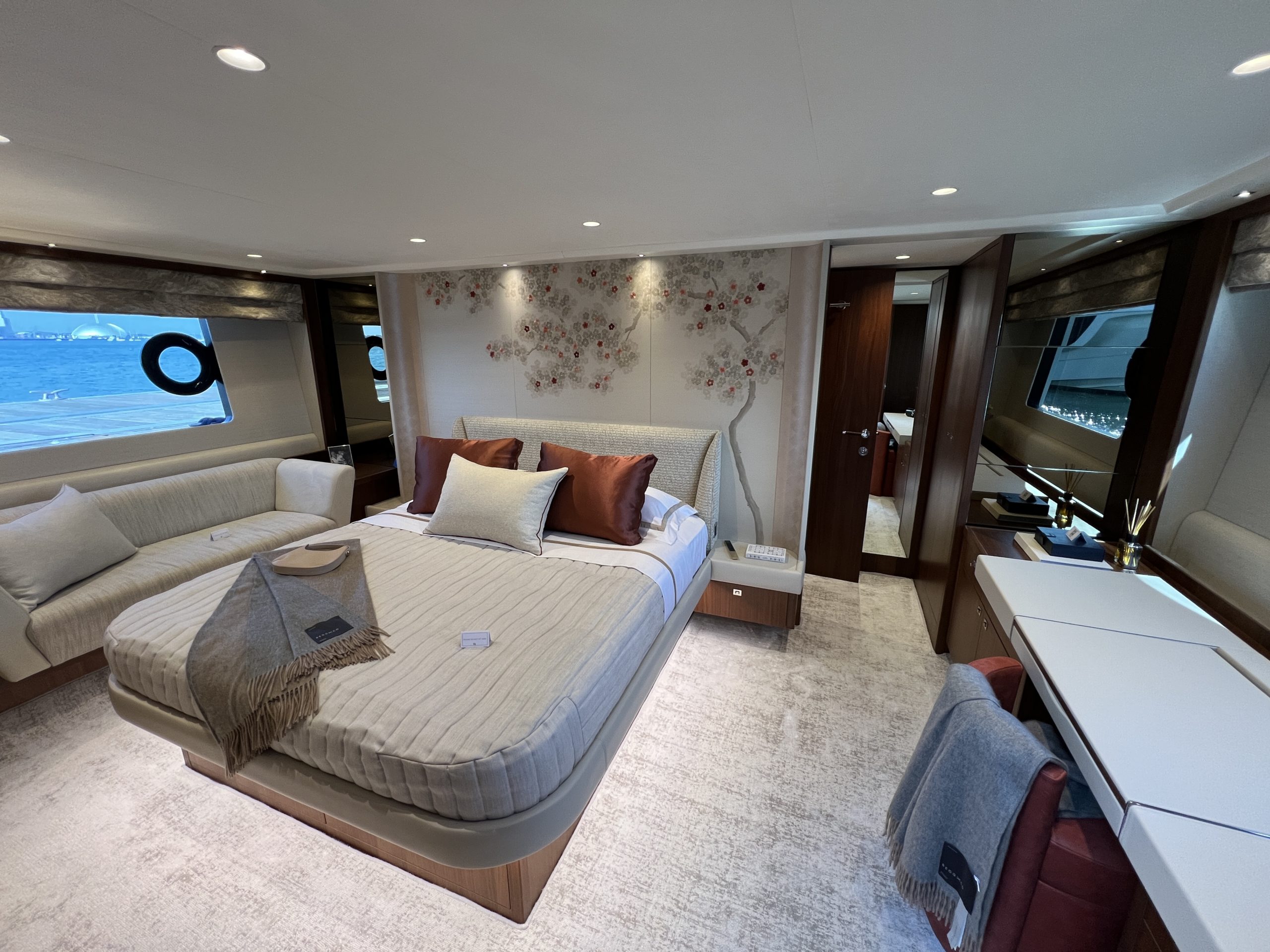 The Master Cabin has a new TV feature column, formental cherry blossom silk embroidered artwork as feature headboard that is hand stitched, a starboard sofa and wine fridges.