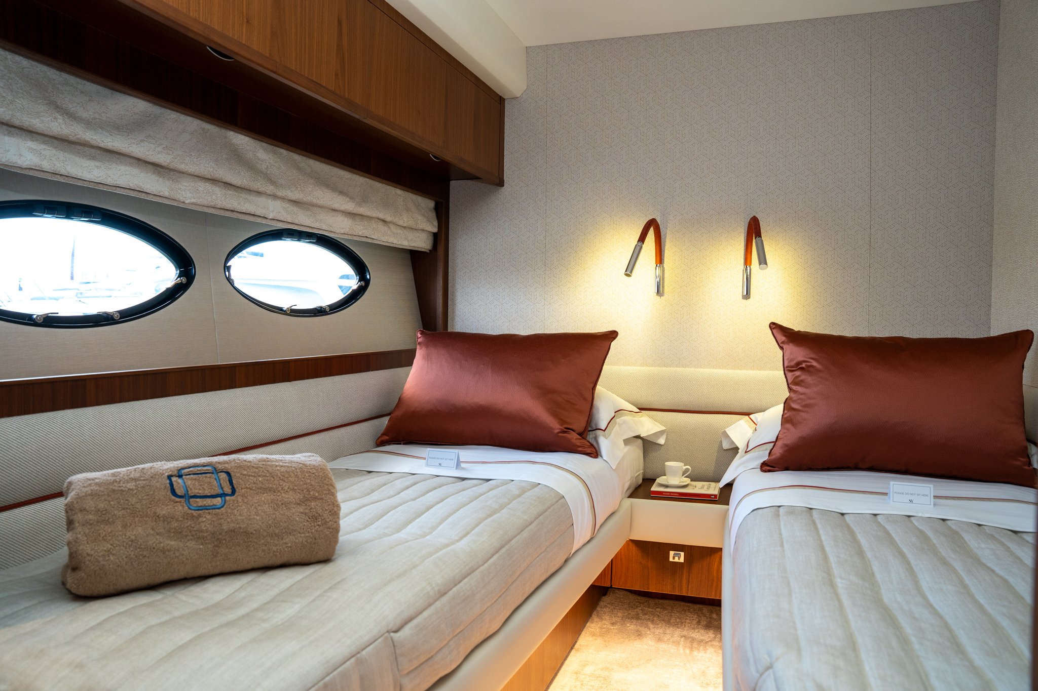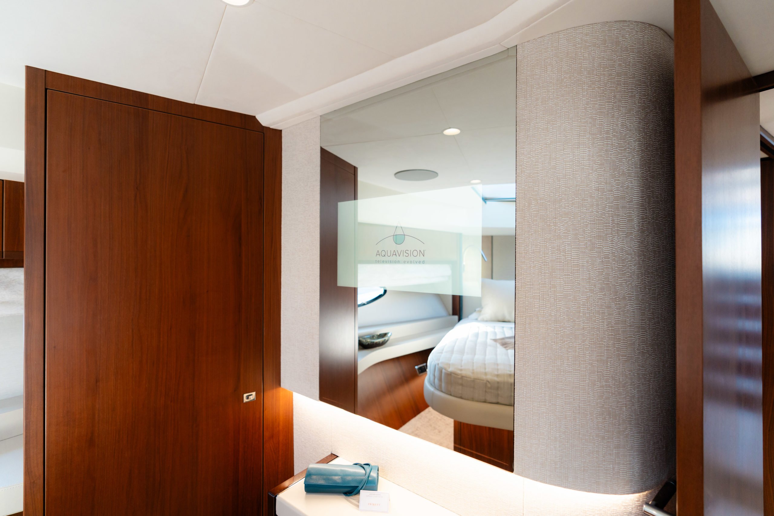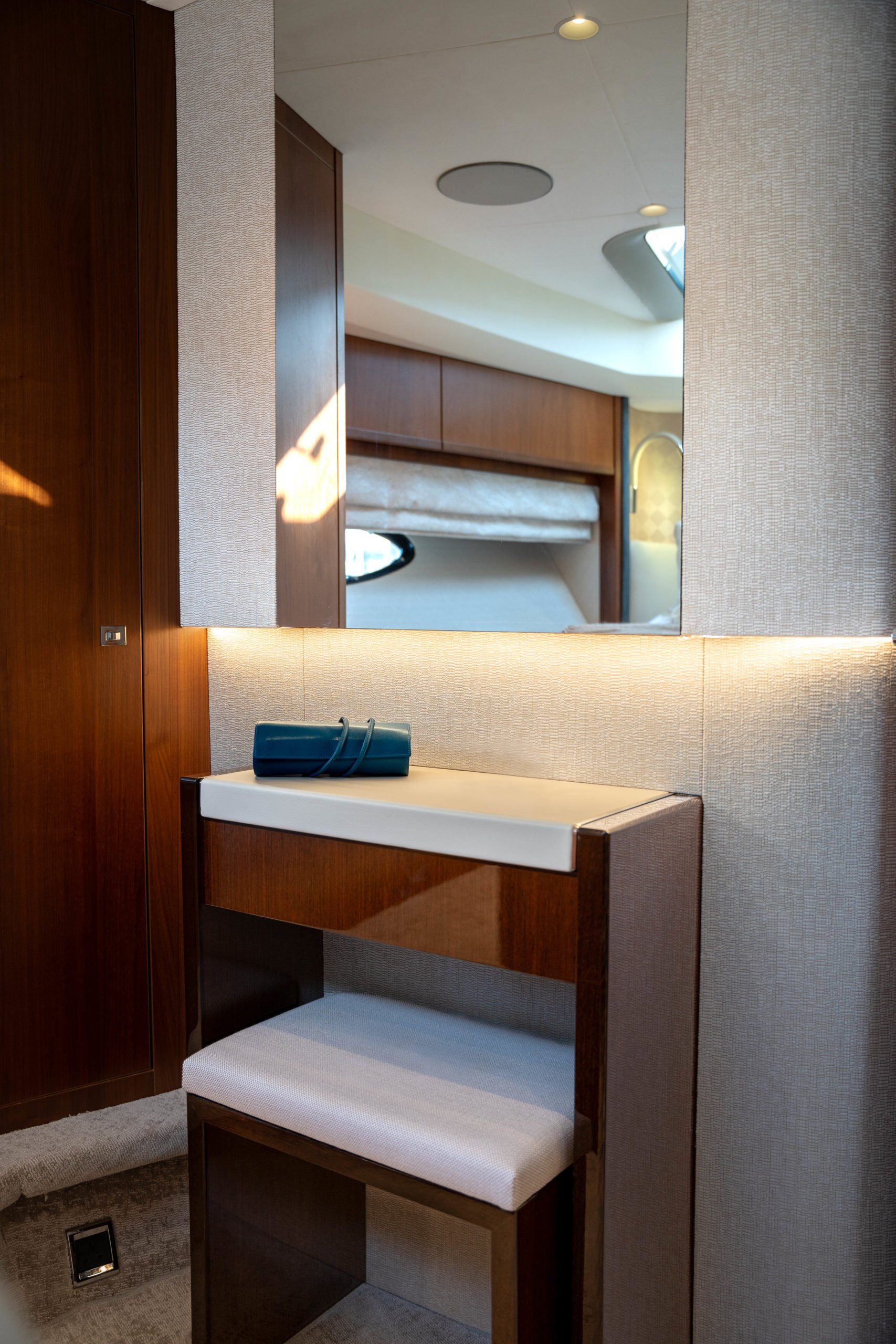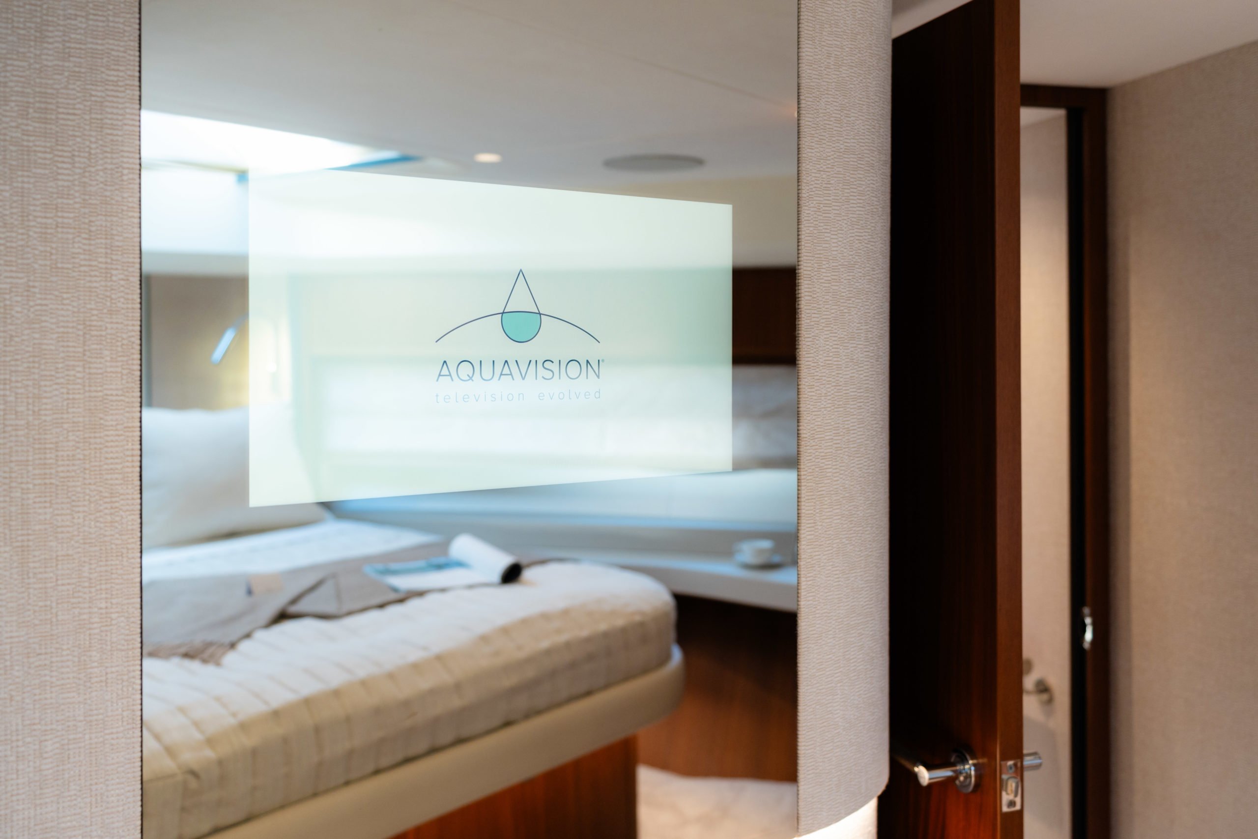 The cabins have been restyled with new headboards, window liners, leather wrap for outboard units and bulkheads, new bed upstands and bedside lights, and a new mirror TV in the Forward Cabin – for vanity unit usage or a TV at a flick of a switch.