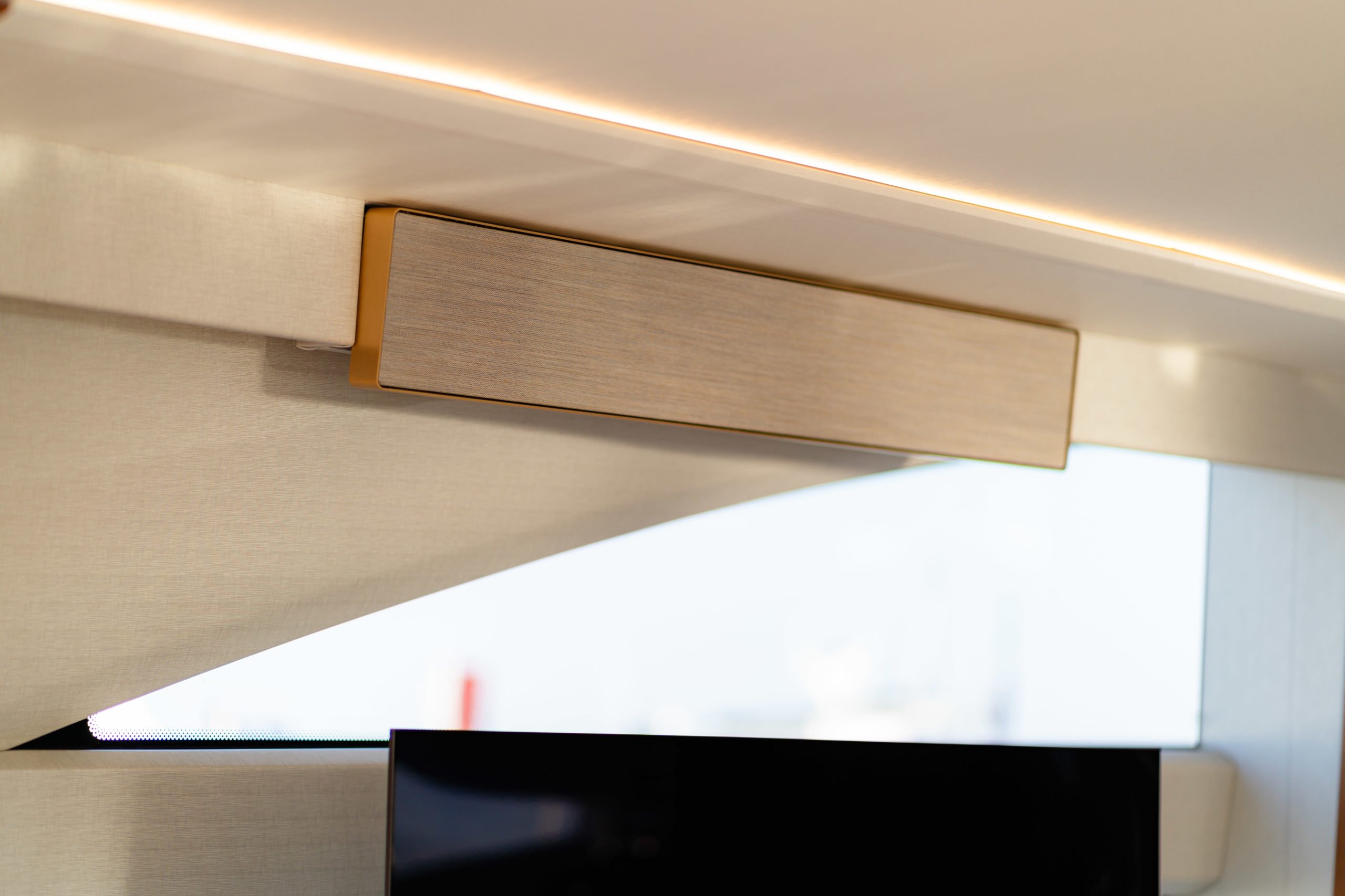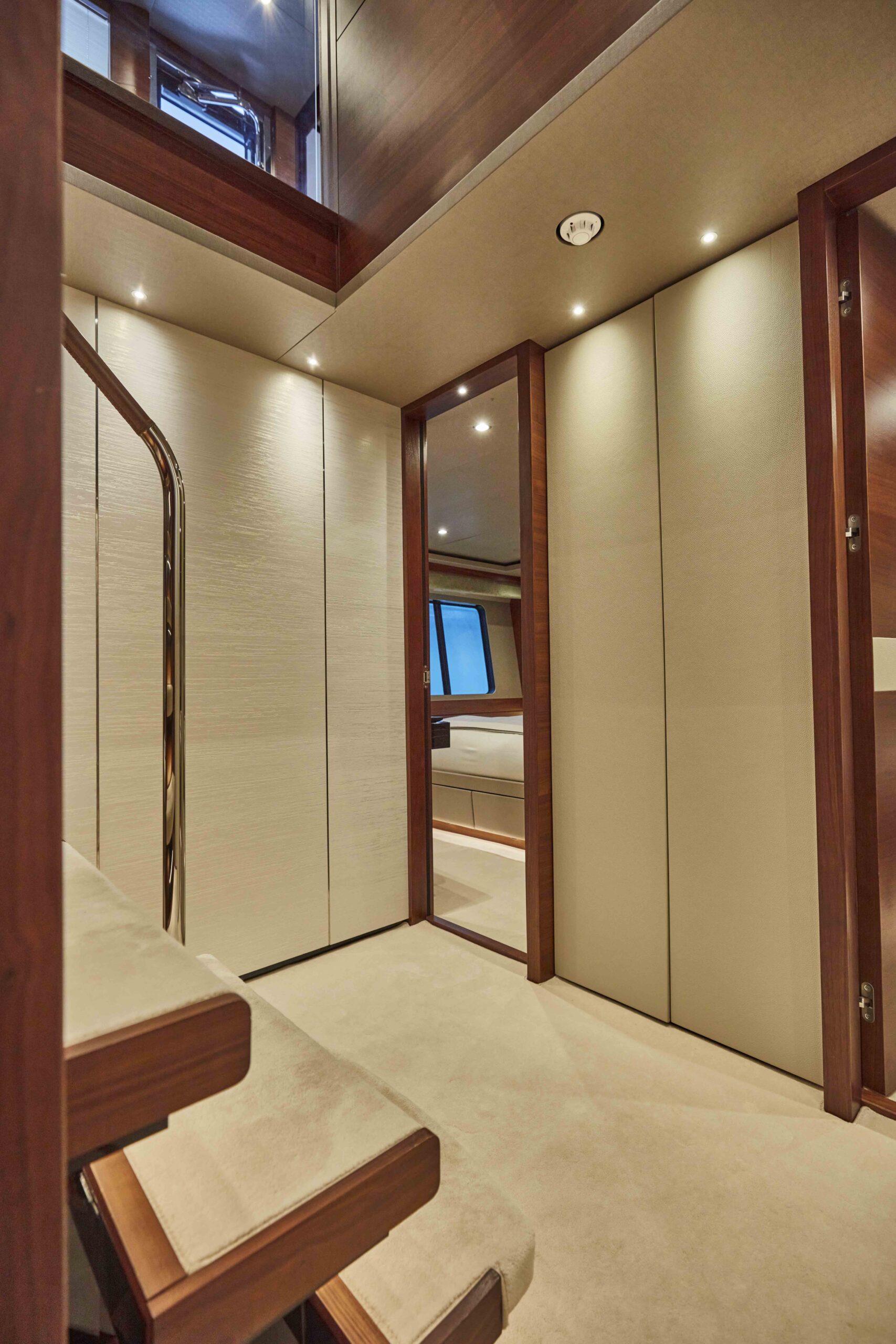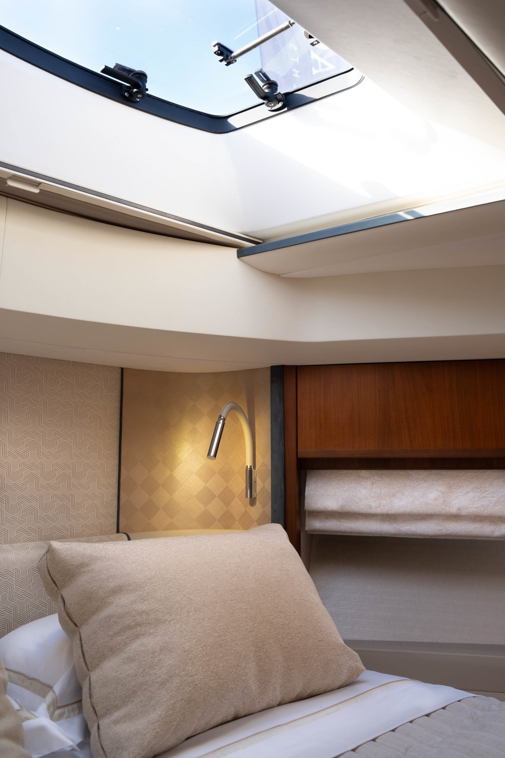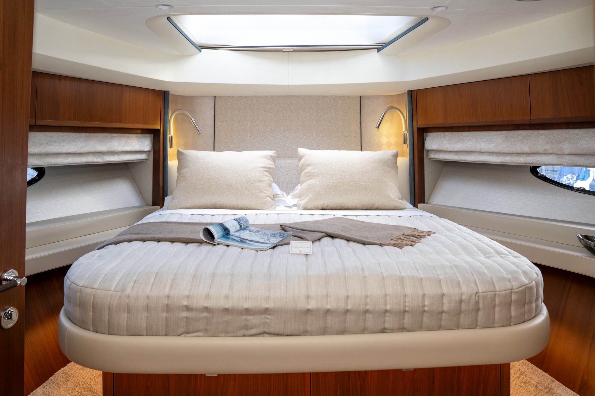 The cabins have been restyled with new headboards, window liners, leather wrap for outboard units and bulkheads, new bed upstands and bedside lights, and a new mirror TV in the Forward Cabin – for vanity unit usage or a TV at a flick of a switch.