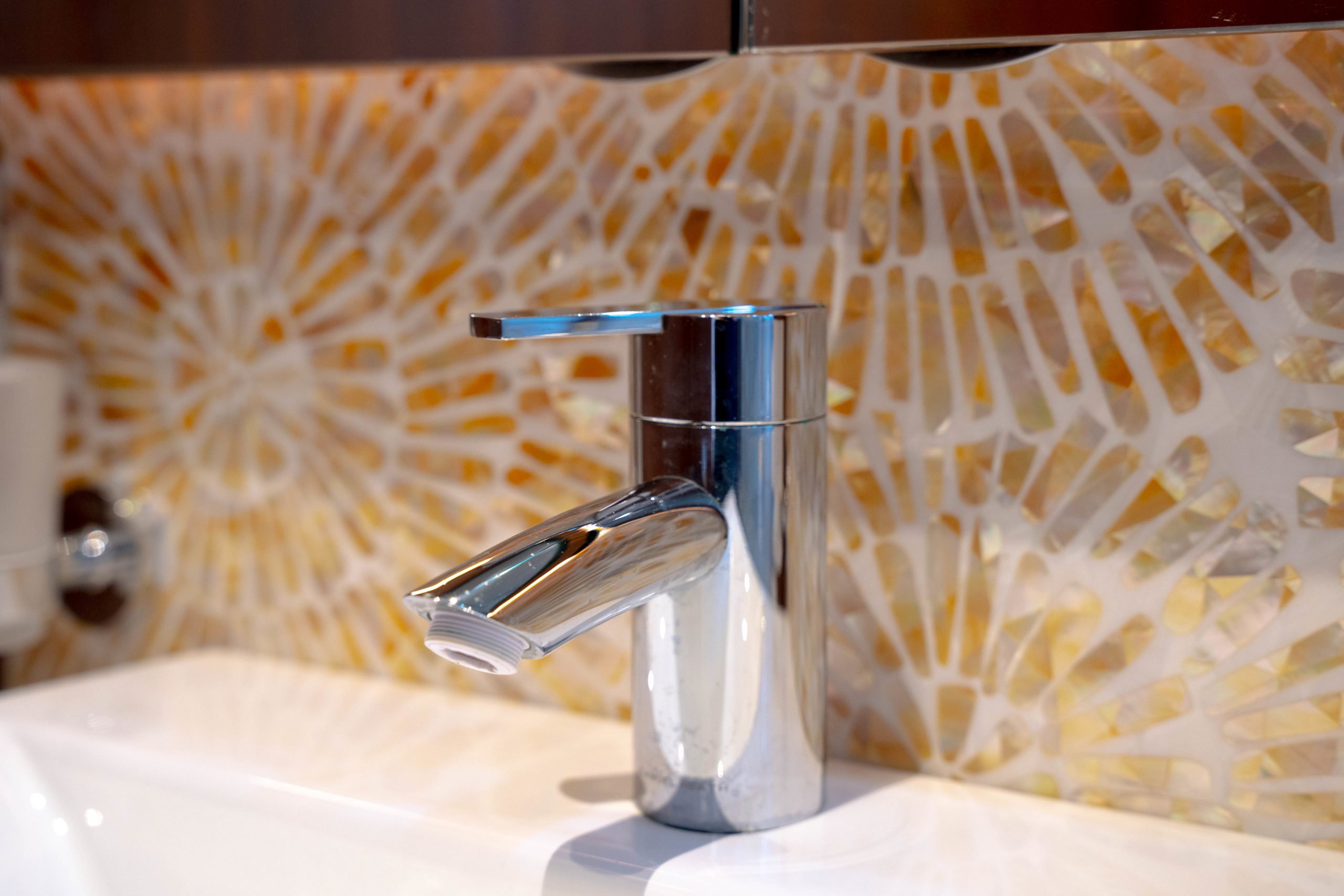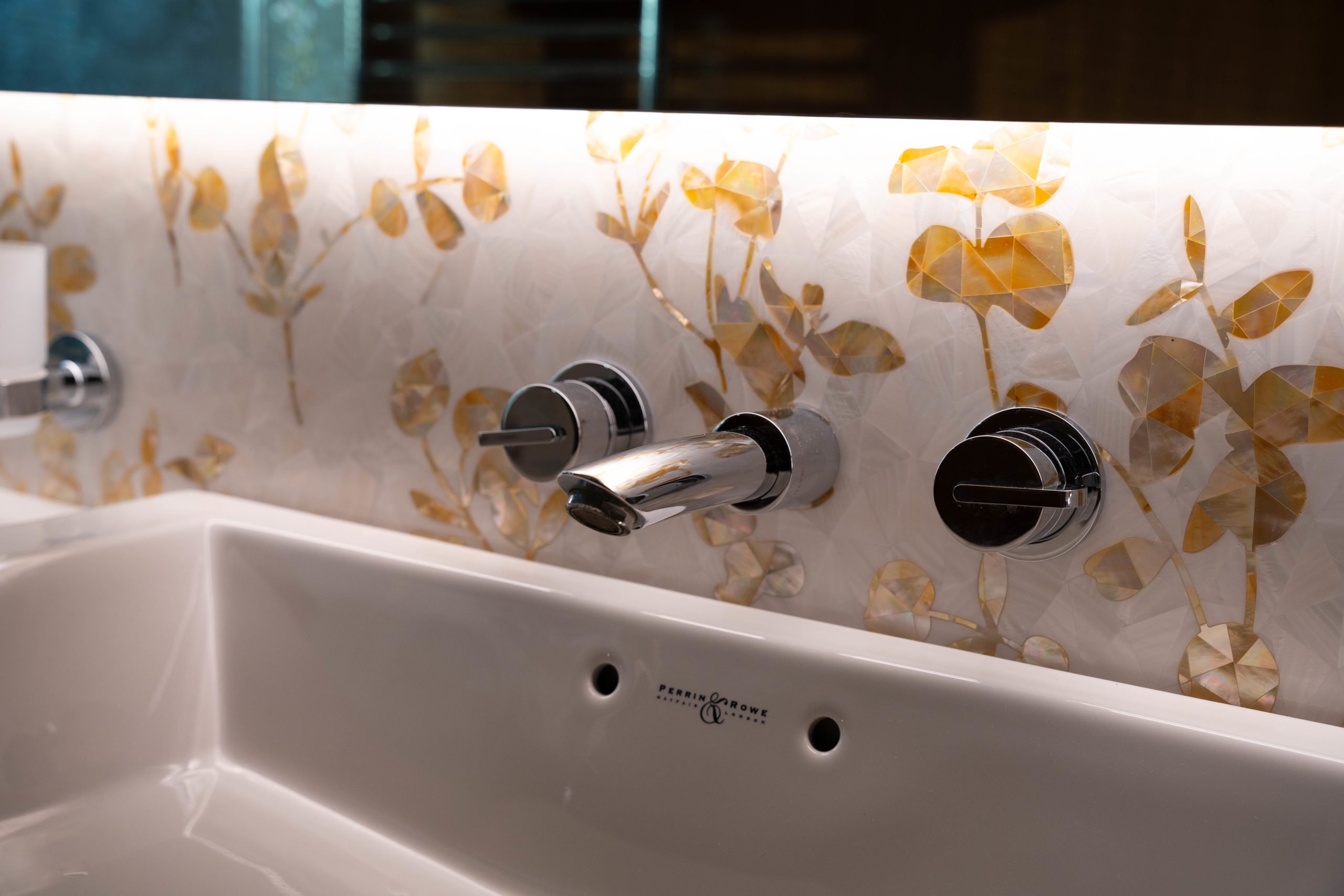 Striking mother of pearl feature panels throughout the Heads means they are also enhanced with unique designs – stunning fusions of freshwater and saltwater pearl. Each piece is meticulously hand-placed – one design inspired by the vibrant bloom of sunflowers and the other elegance of freshwater pearls with the intricate design of delicate leaves. The individual movement of these sustainable pearls captivates the eye, with colours reflecting natural light and enveloping the space in a warm, luxurious ambiance.