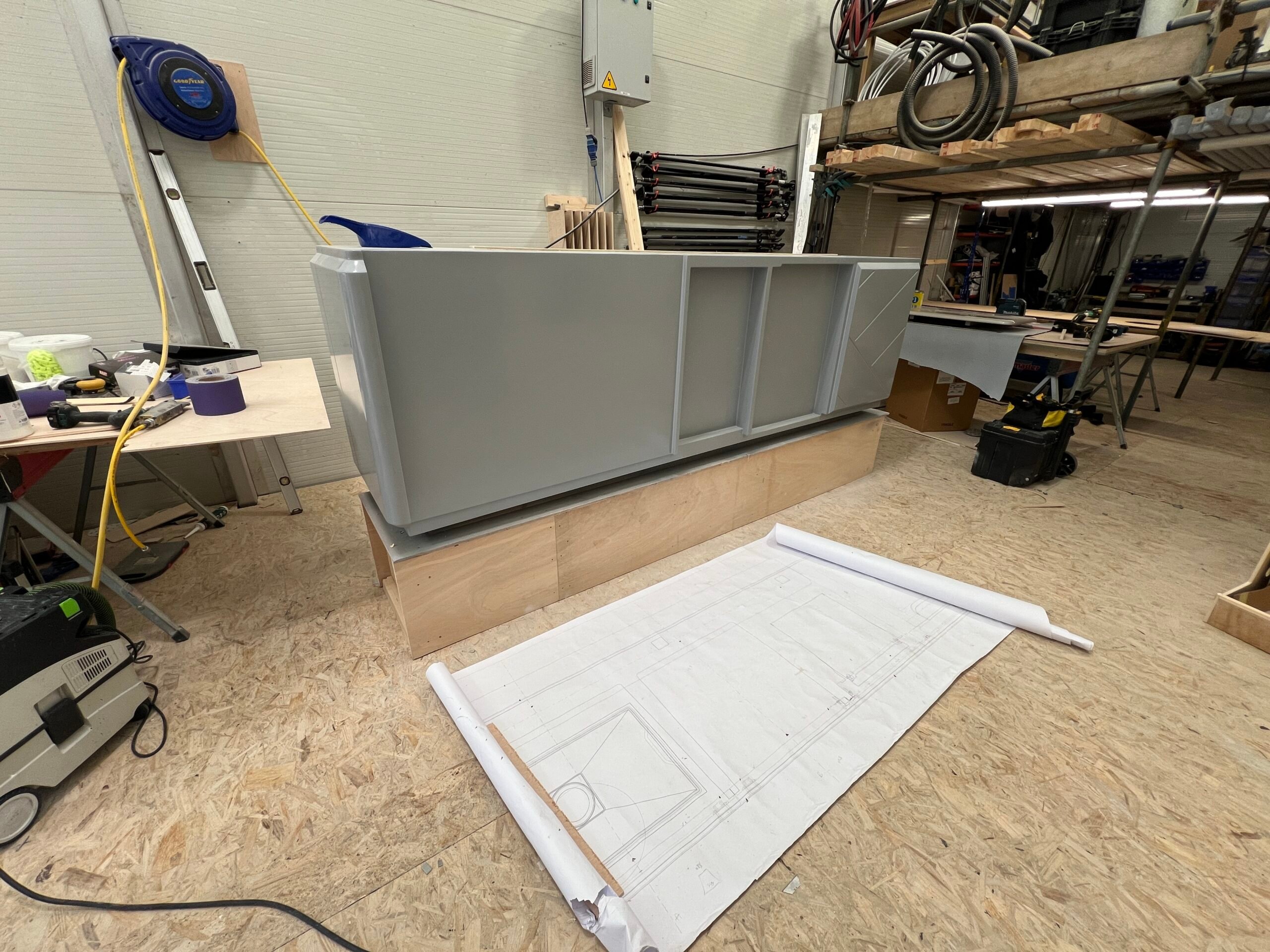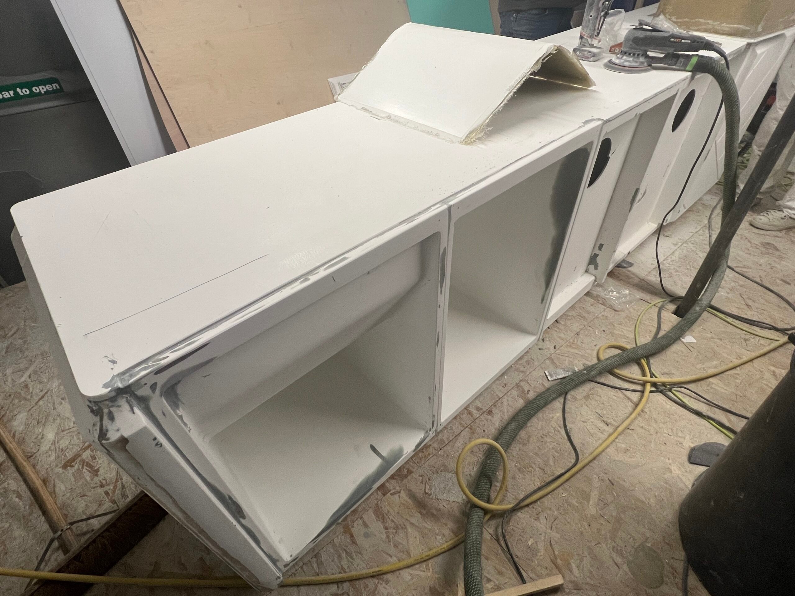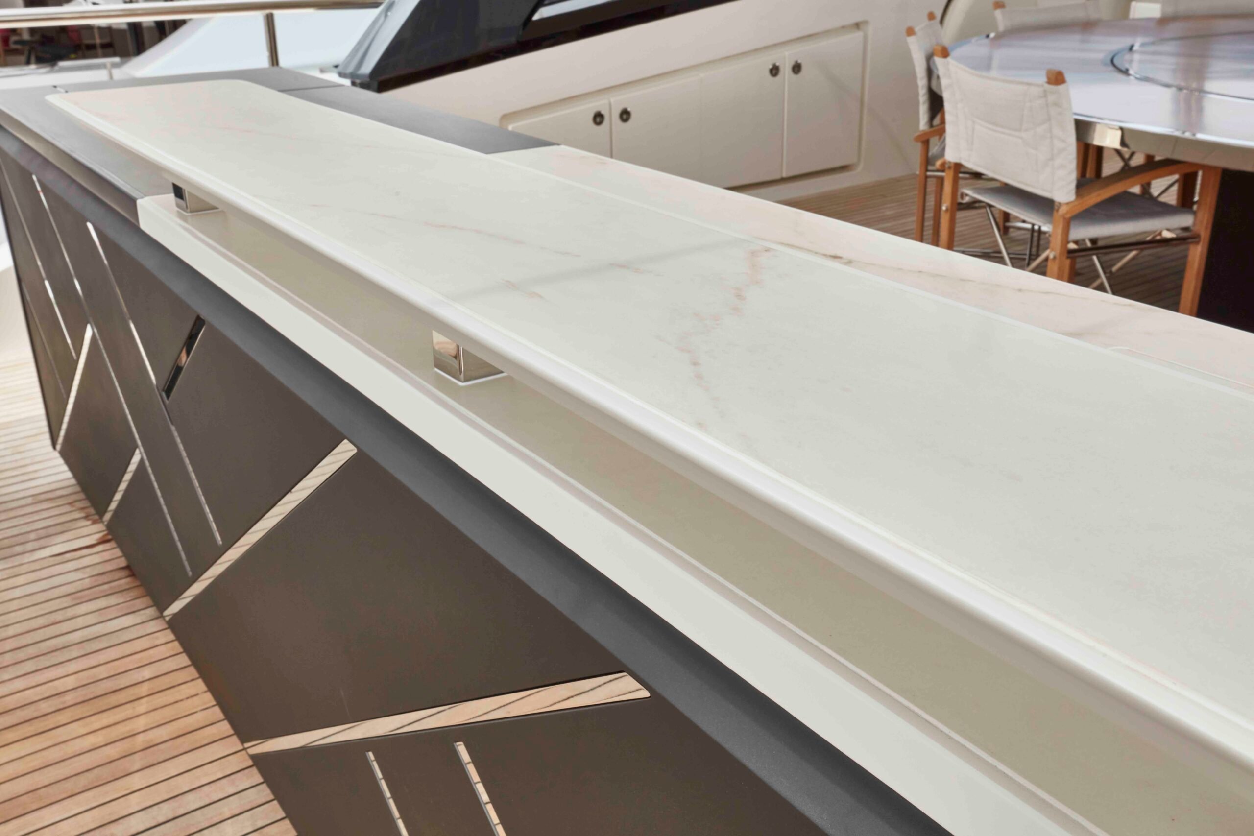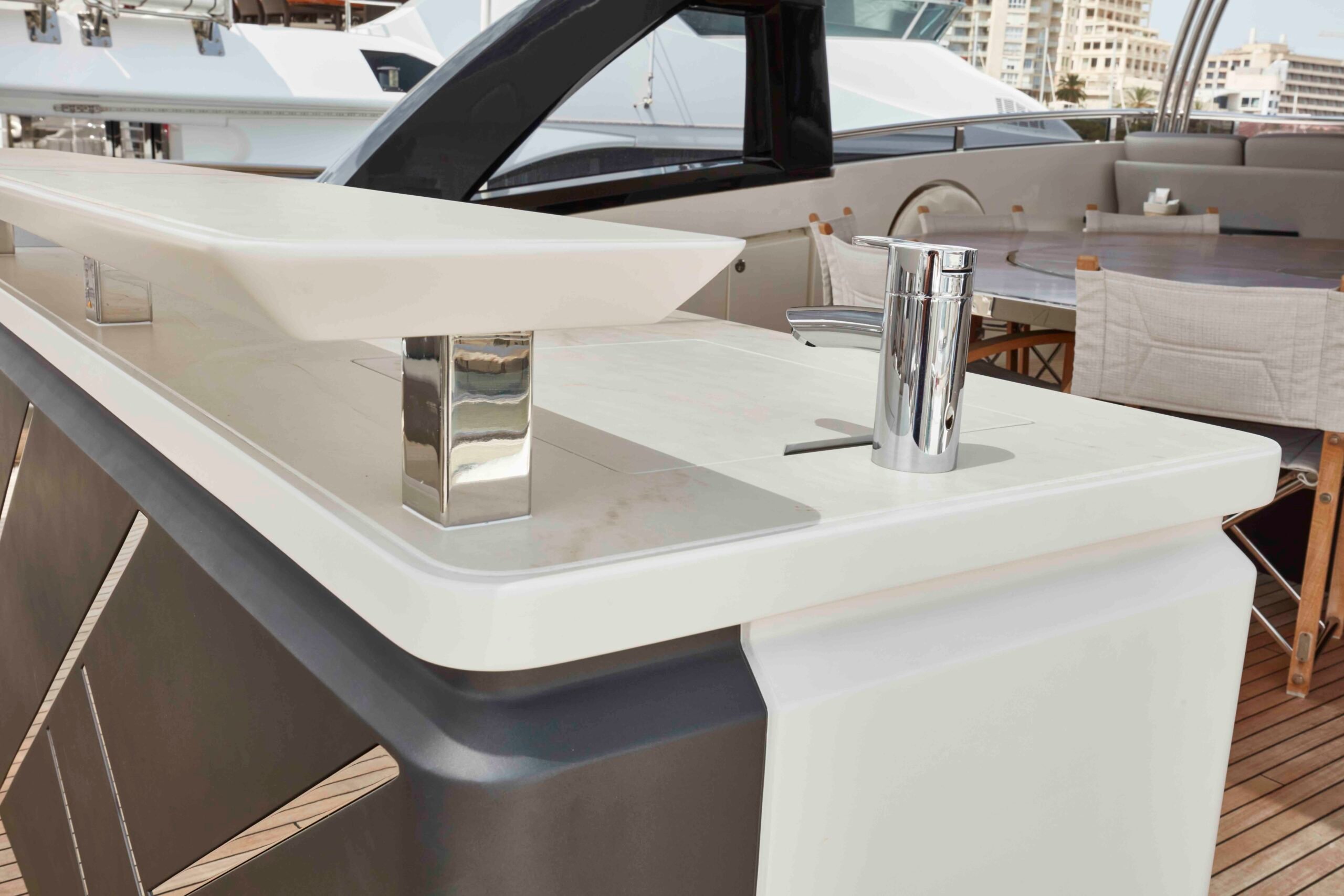 We were asked to remove the 2 existing smaller bars on a Princess 35M Flybridge and create 1 large bespoke bar to stand in their place. This would be a much more user friendly, practical and beautiful looking unit. This involved replacing parts of the teak deck, and designing, manufacturing and engineering a fully custom bar unit from Plywood plug to GRP molding.