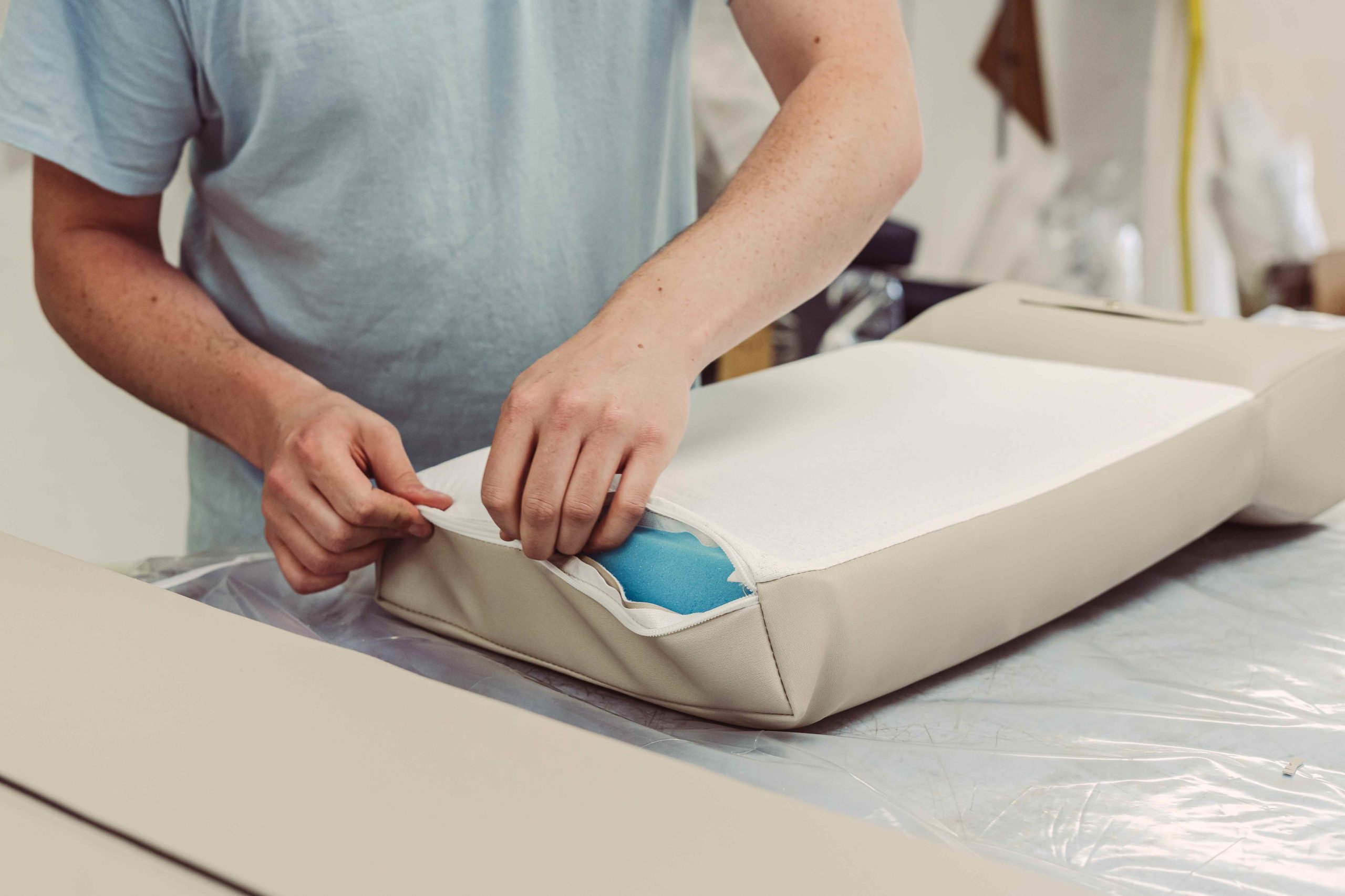 ‘I’m a big believer in zero or minimal toxins in an environment. The foam in chairs, sofas and cushions breaks down as it ages and deteriorates, releasing dust foam particles into the air. These particles are toxic and we’re breathing them in, so that’s a problem we need to eliminate.’’